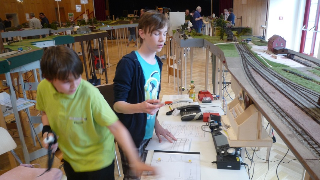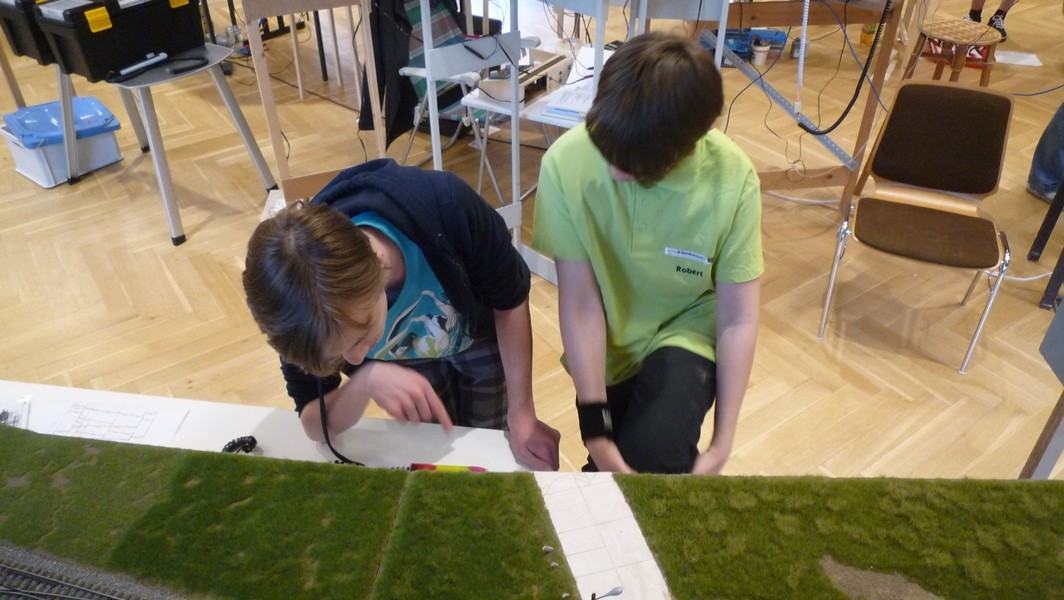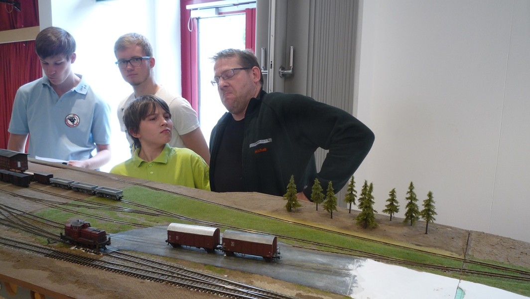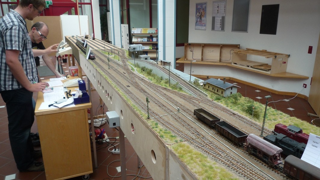 Gerade sind zwei junge Fahrdienstleiter bzw. ein Fahrdienstleiter und ein Rangierer am Werk und haben