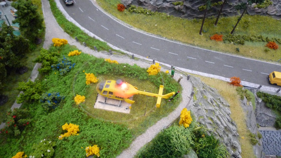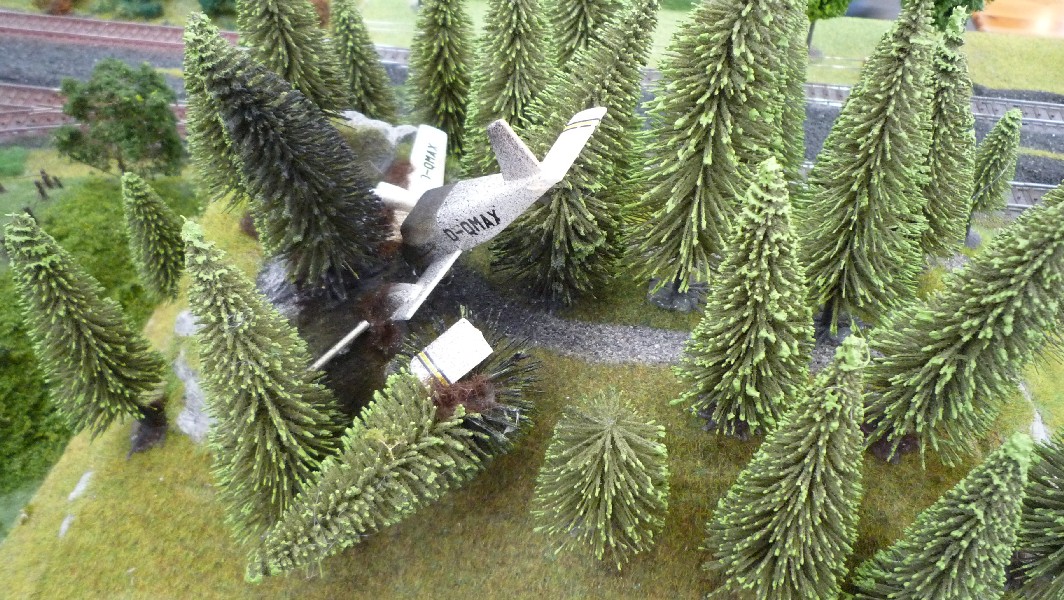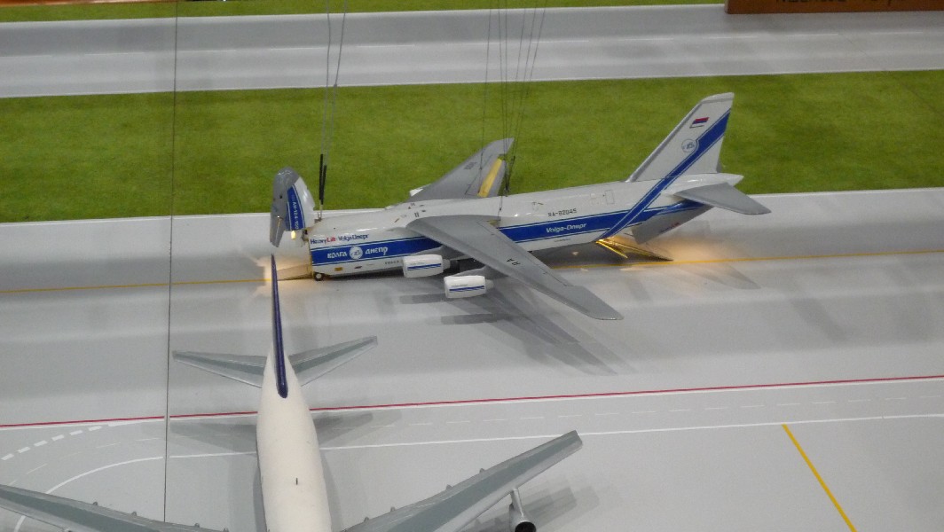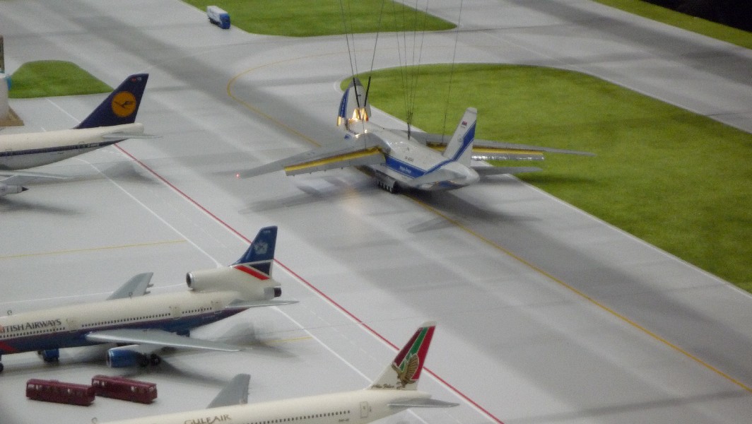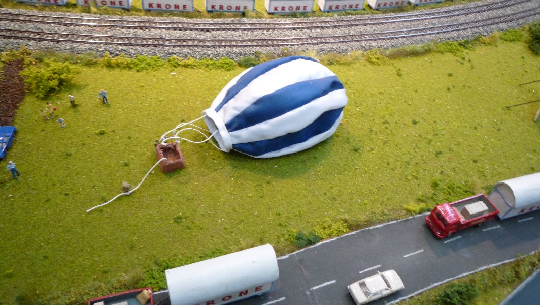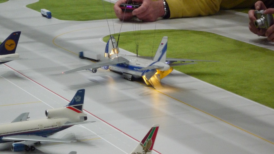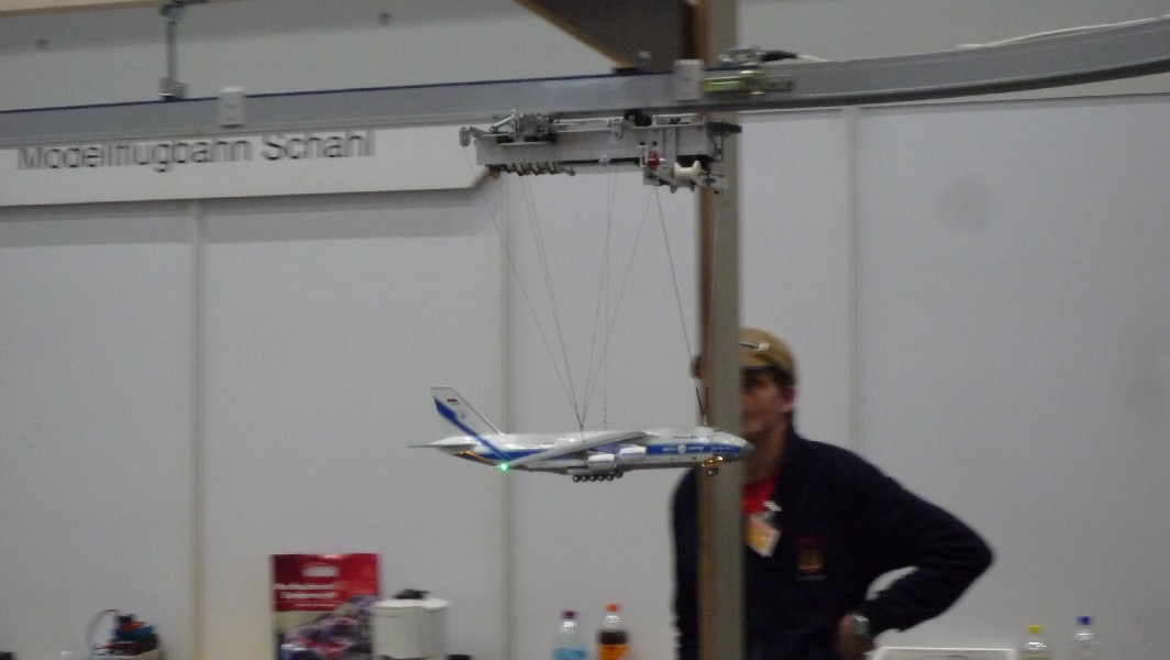 Sehr interessant war die Flugschau, die regelmäßig vorgeführt wurde. Ein Flugzeug (an einigen Seilzügen befestigt) wird mit einem Spur N LKW beladen und fliegt dann am Schlitten hängend (der viel Technik und Motoren beinhaltete) über die Anlage.