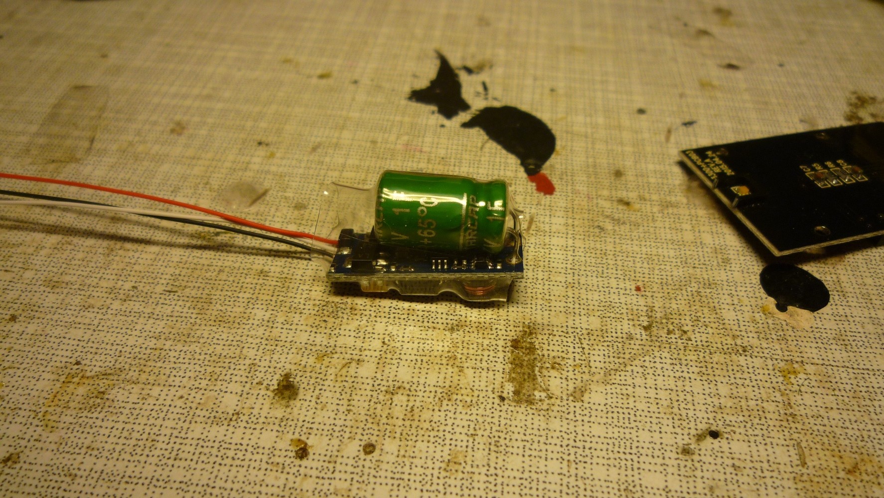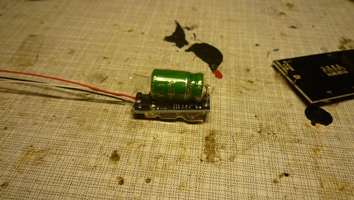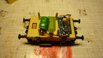 Auf den Decoder wird die Platine des Powerpacks gelegt. Der Kondensator findet im Freiraum in die Mitte
