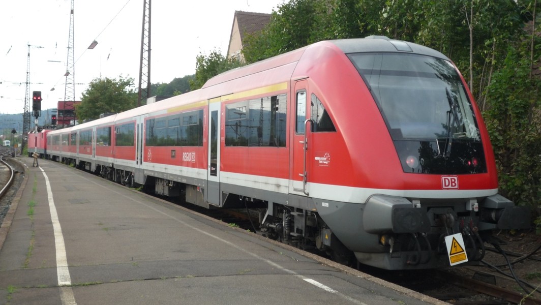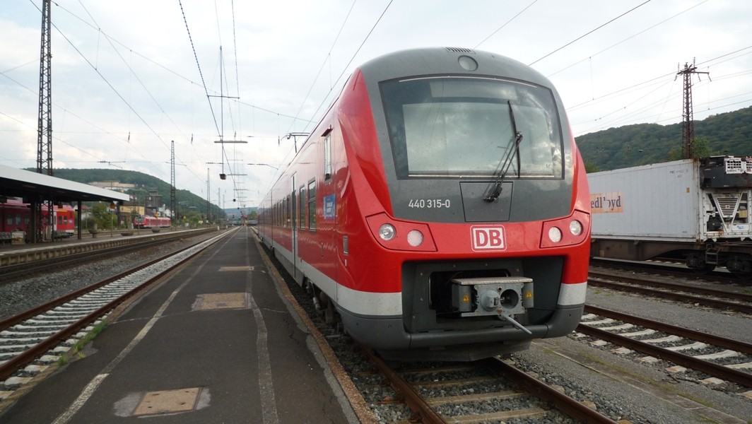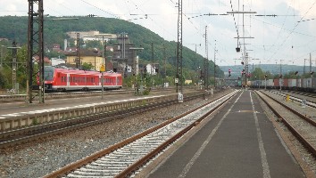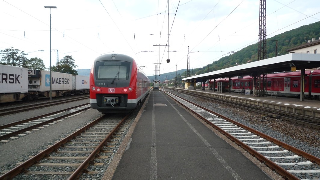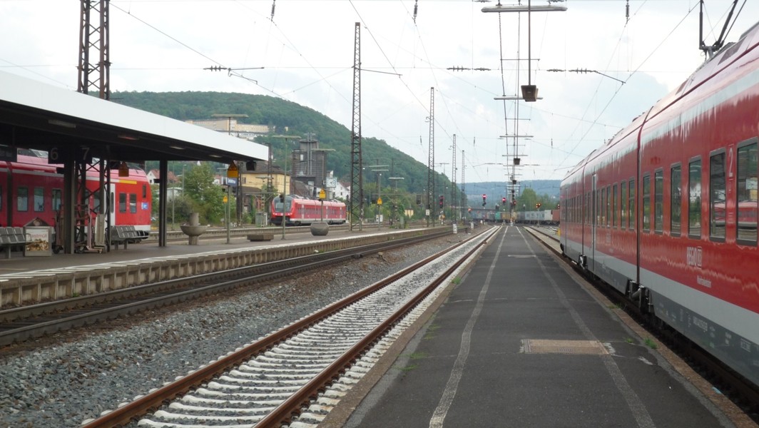 Eine BR 440 steht auf Gleis 6 zur Fahrt nach Würzburg bereit. Es ist sehr selten, dass vierteilige Fahrzeuge auf diesem Streckenabschnitt eingesetzt werden, doch an diesem Tag war dies der Fall. Wegen Streckensperrung (Baustelle) stand der Triebwagen schon bereit, normalerweise haben die Regionalbahn Fahrzeuge nur kurz Aufenthalt und fahren gleich weiter, abgesehen vom RE, der eine Standzeit von 5 Minuten aufweist.