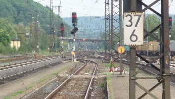 Eine Signalbrücke der größeren Art steht an der westlichen Bahnhofseinfahrt von Gemünden.