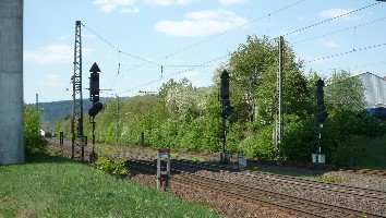 Die Ausfahrsignalgruppe in Richtung Westen. Der Abzweig vom Gleisdreieck mündet schließlich in die Stammstrecke, schließlich folgt noch ein Gleiswechsler.