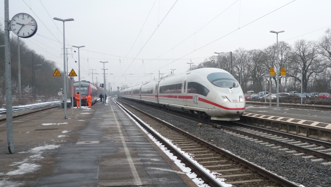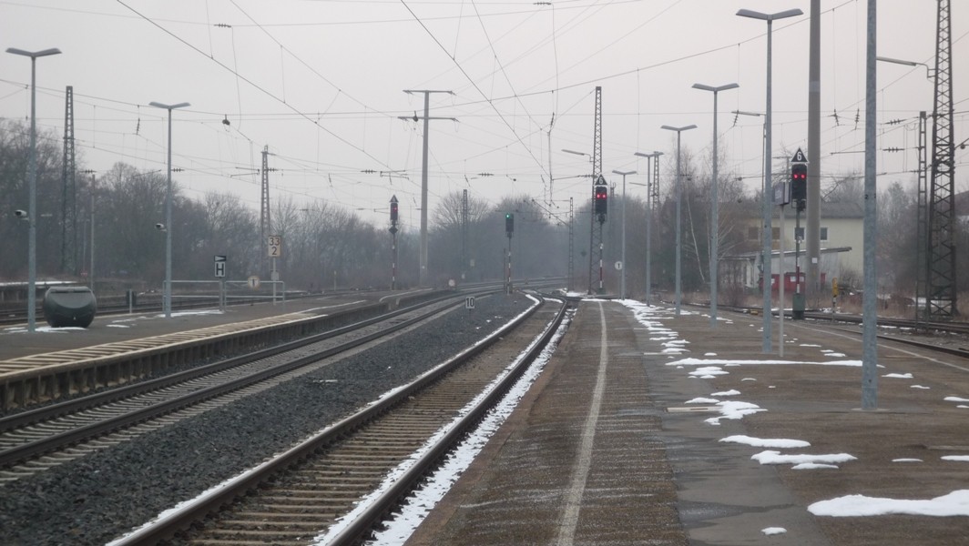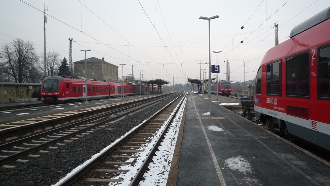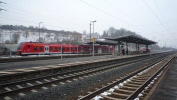 Soeben ist auf Gleis 2 der RE aus Nürnberg zur Weiterfahrt nach Würzburg angekommen.