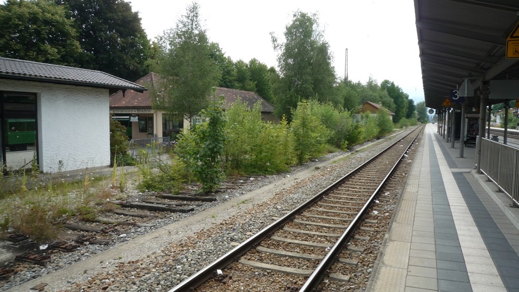 Vom Bahnhof sieht man auch schon die Chiemseebahn (links das beige Gebäude).