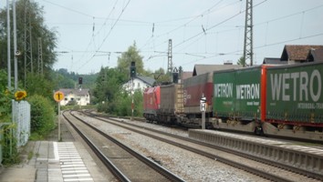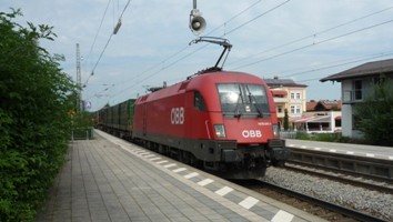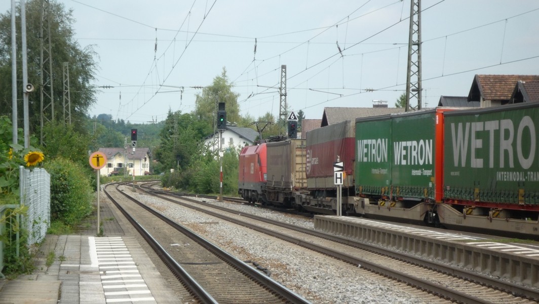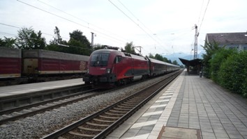 Ein Güterzug ist auf Gleis 3 eingefahren, um den nachfolgenden Railjet nach München vorbei zu lassen.