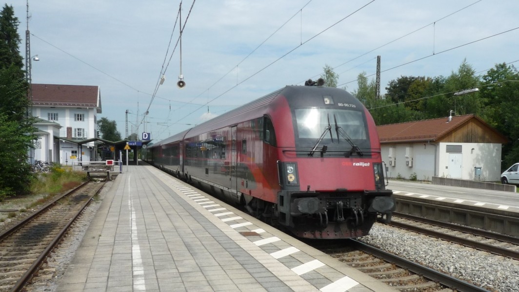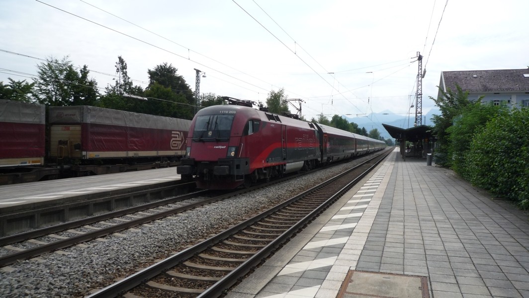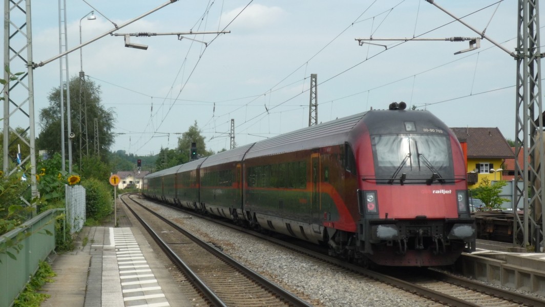 Das ist wirklich sehr knapp, gerade mal 3 Minuten später rauscht der Railjet Budapest-Keleti pu durch Prien und muss dazu das selbe Gleis