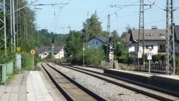 Blick Richtung Süden vom Bahnhofsgebäude aus. Es fährt soeben die Chiemgaubahn aus Aschau ein, die dazu das Streckengleis Richtung Salzburg