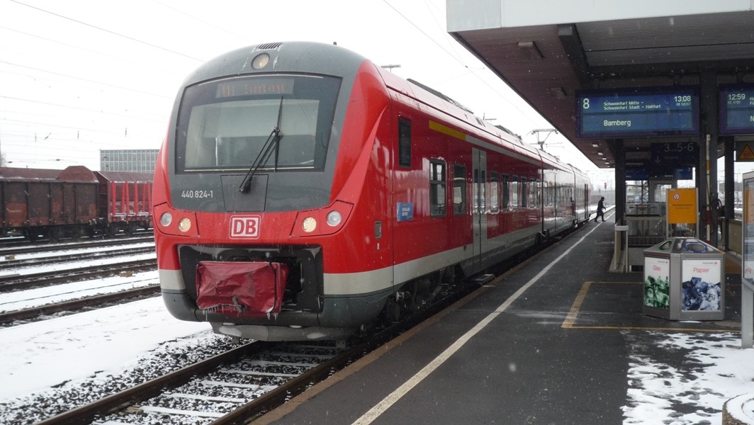 kommt wie gewohnt um 12:38 Uhr in Schweinfurt Hbf. an, fährt aber erst um 13:08 Uhr weiter nach Bamberg. Grund ist der