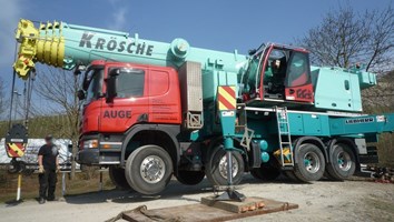 Der Mobilkran nimmt noch ein Zusatzgewicht auf. Hier sieht man das Gewicht noch auf der Kranfläche liegen.