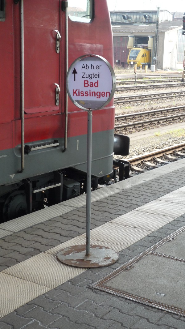 Seit neustem steht am Bahnsteig ein Schild, welches darauf hinweißt, wo der Zugteil nach Bad Kissingen steht, denn die BR 612 Triebwagen werden in Ebenhausen geteilt und der hintere Teil fährt nach Erfurt (ab Schweinfurt der Vordere, da dort die Richtung gewechselt wird).