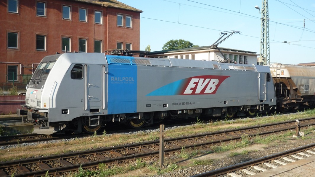 Am 18. August 2012 pausierte die BR 185 der EVB im Würzburger Hbf. mit ihrem Güterzug.