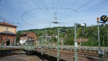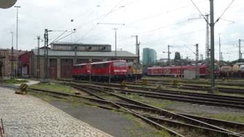 Blick auf den Lokschuppen mit den zahlreich abgestellten E-Loks.