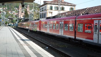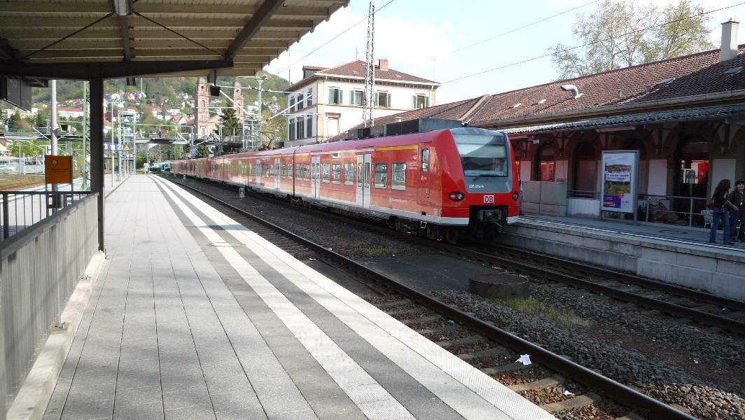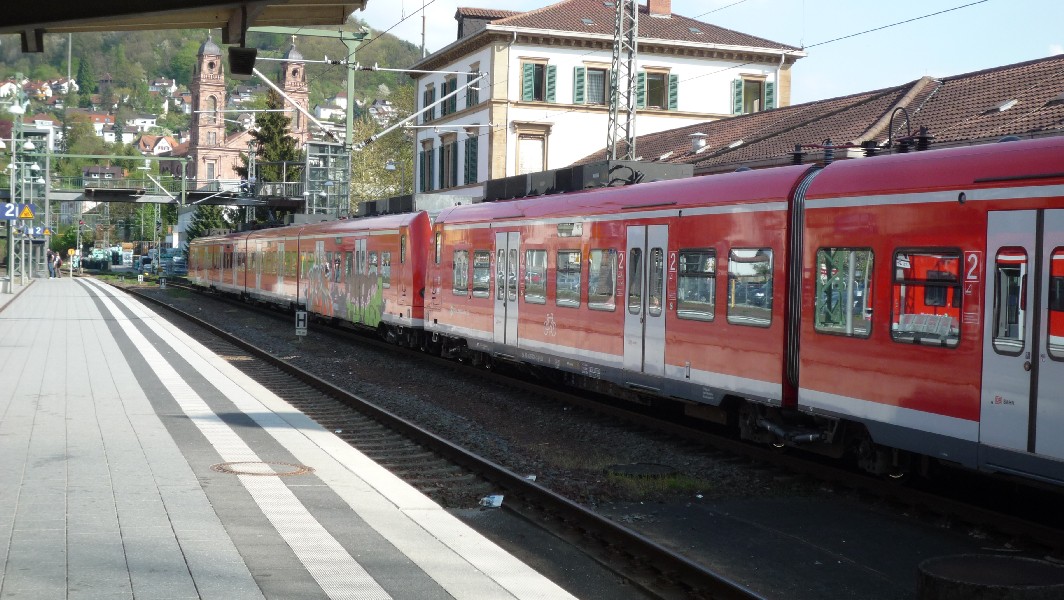 S2 nach Mosbach. Dieser Zug fährt zunächst erstmal in die Gegenrichtung, macht aber in Mosbach Kopf und wird mich dann nach Eberbach befördern. Wer's nicht glaubt: Einfach auf die Triebfahrzeugnummer schauen ;-)