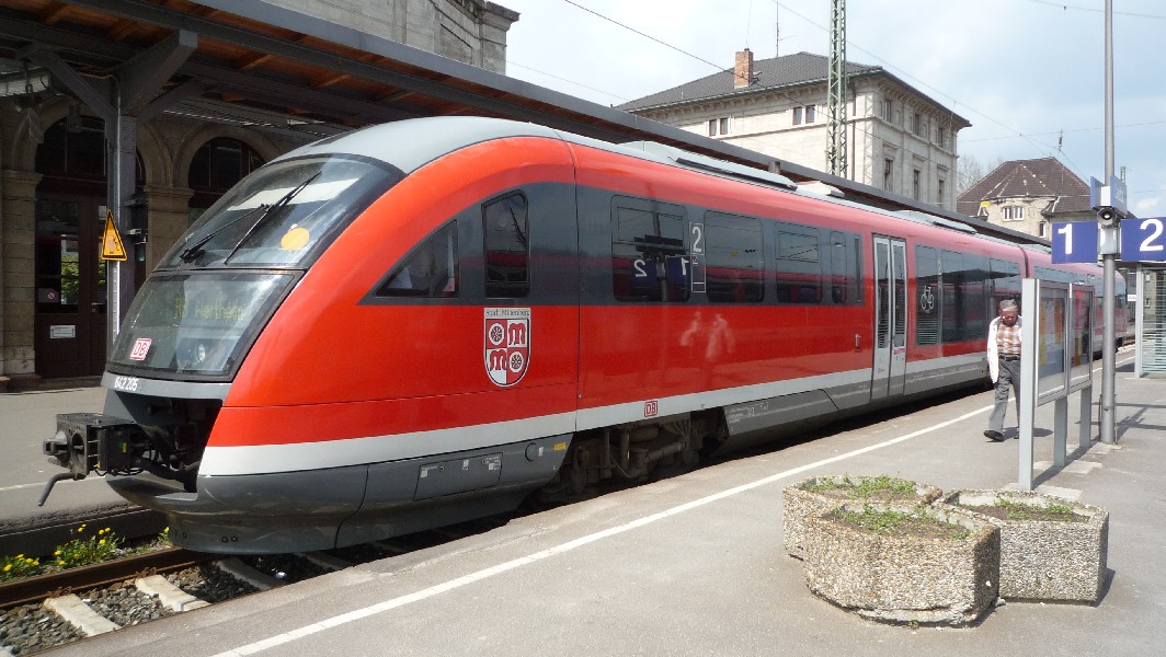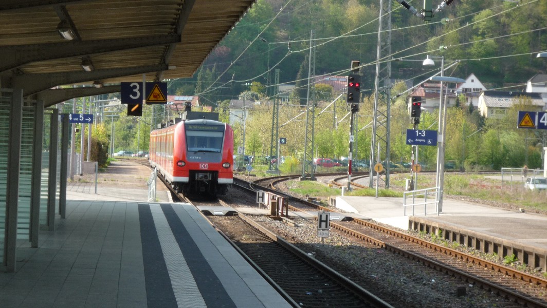 Auf Gleis 1 steht fast immer die RB nach Stuttgart bereit (der Zug fährt immer um 54 ab, Fahrplankenner wissen die daraus resultierende Standzeit bei einem 60-min-Takt).