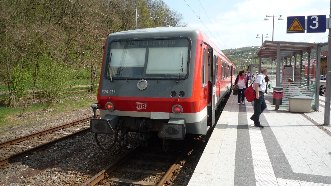 Ich bin nun mit RB 33653 in Buchen angekommen. Dieser Zug kommt auf Gleis 1 an und setzt auf Gleis 2 um. Von dort fährt BR 628 um 14:55 Uhr als RB 33634 nach Miltenberg zurück.