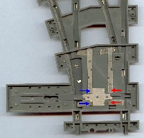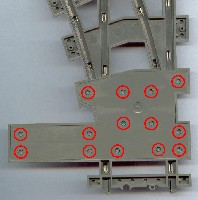 Die Weiche wird geöffnet, indem die Plastiknupsis (rote Kreise) mit einem Schraubenzieher weggekratzt werden.