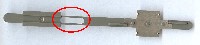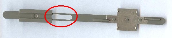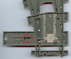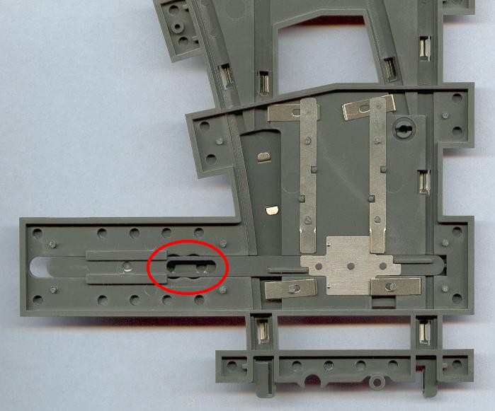 Da der Antrieb die Weiche verriegelt, muss als erstes die werksseitige Verriegelung am Stellhebel entfernt werden, da diese eine Leichtgängigkeit des Antriebs verhindert. Daher muss der Weichenstellhebel ausgebaut werden, um die beiden Knubbel zu begradigen (roter Kreis).