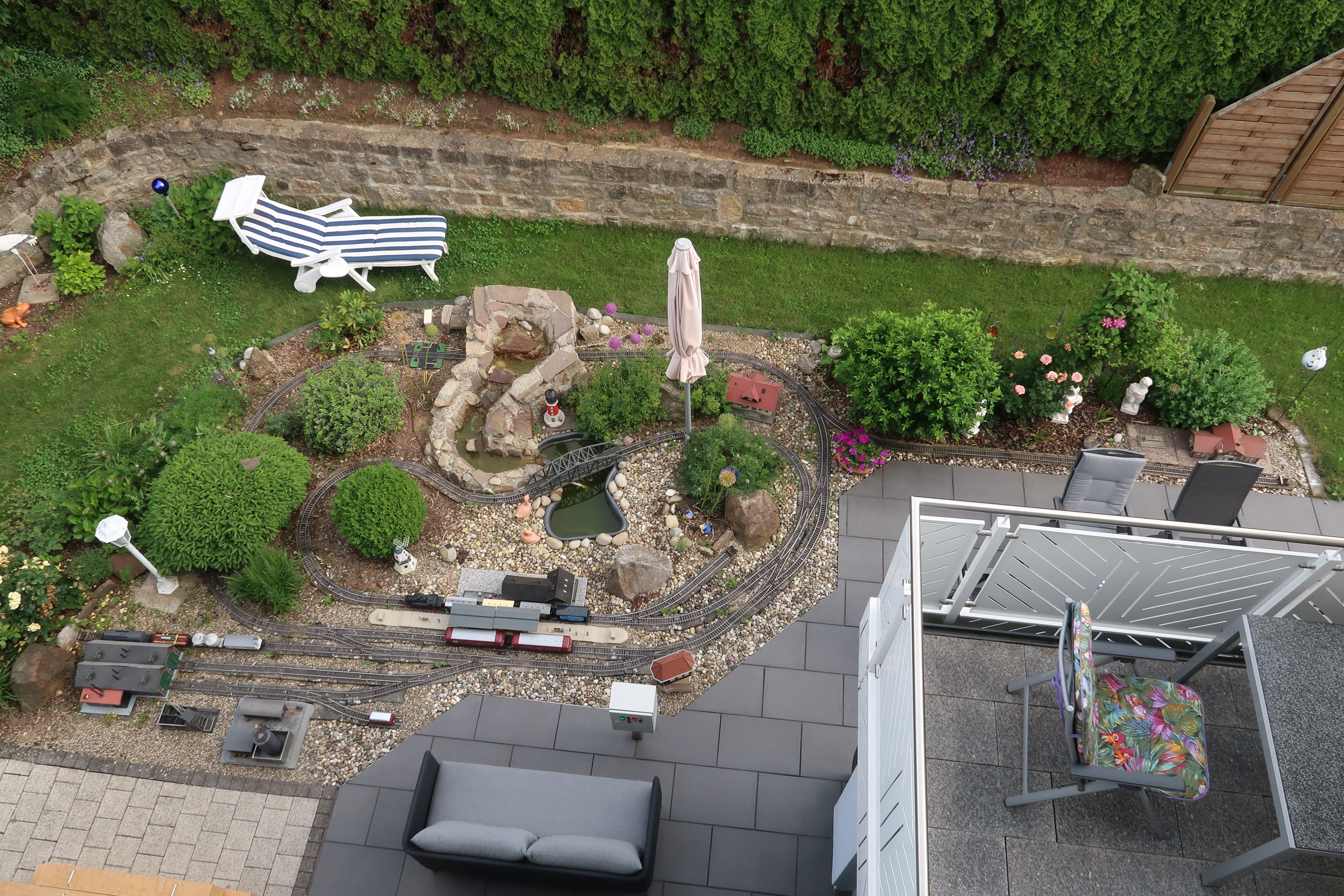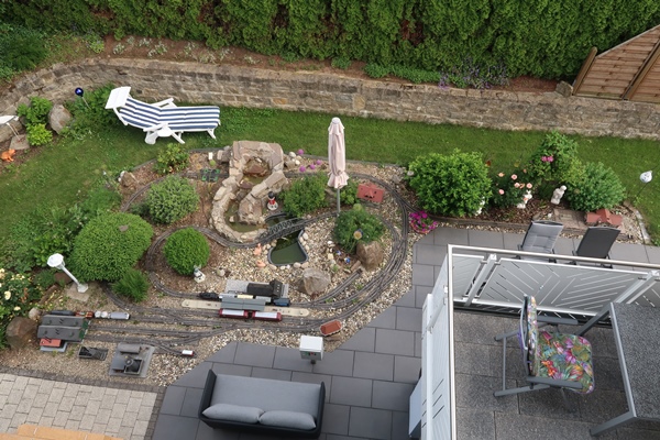 Die 18,7 m² große Gartenbahn ist mein zweit größtes Werk, damit habe ich mir einen großen Traum erfüllt. Gefahren wird nur im Sommer, weshalb