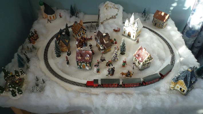 Der Bau dieser 0,5 m² kleinen Anlage war eine spontane Entscheidung. Beim Bummeln auf dem Weihnachtsmarkt von Möbel Neubert sah ich eine Anlage im Winterstil mit einem Fleischmann Zug. Mir war sofort klar, dass ich so etwas auch brauche. Da ich noch altes Märklin M-Gleismaterial hatte (Loks und Wagen sowieso) wurde das ganze auch relativ preisgünstig. Die Häuser sind aus Porzellan, die es immer auf den Weihnachtsmärkten zu kaufen gibt. Die Menschen sind auch aus Porzellan. Drei Laternen sind von Viessmann und ein beleuchteter Tannenbaum von Busch. Die restlichen Tannen sind ebenfalls von Busch und wurden mit weißer Farbe bemalt. Die Anlage wird von der Märklin Mobile Station gesteuert und den Kindern aus der Verwandtschaft macht es Spaß, wenn sie auch einmal fahren dürfen ;-)