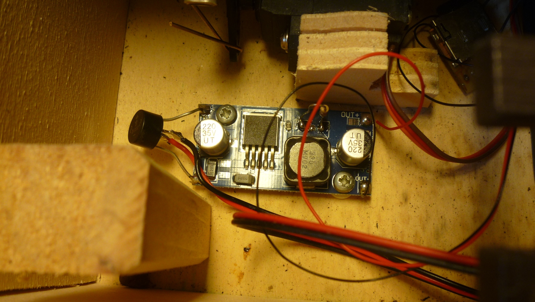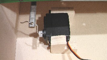 Das Servo habe ich mit zwei Holzklötzchen mit der Holzkiste verschraubt und mit einem Draht eine Verbindung
