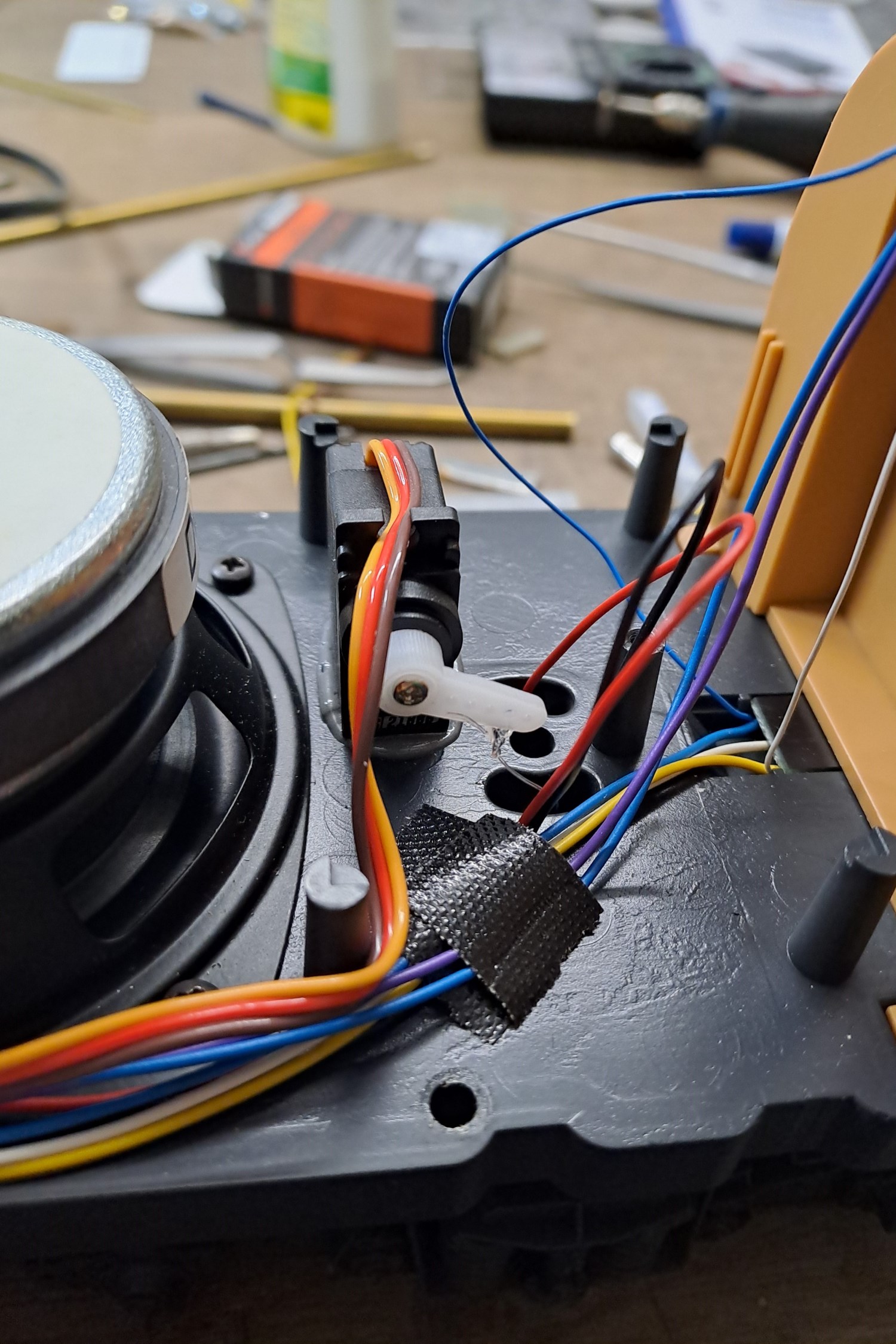 Der Lichtleiter ist abgetrennt und separat eingesetzt. Dahinter befindet sich direkt die LED. Die Zuleitungen sind die Kupferlackdrähte. Ich habe zwei Kontaktfedern