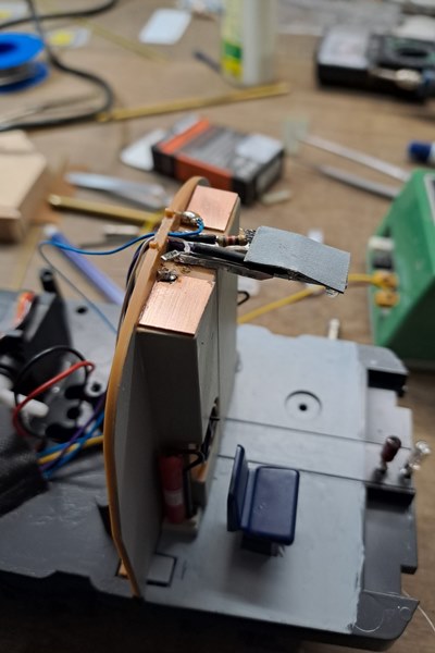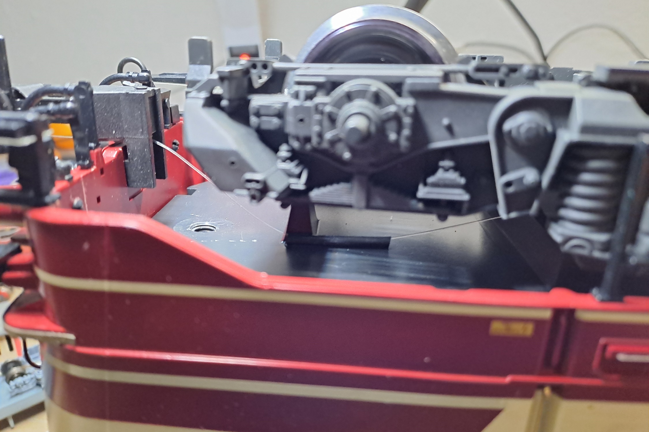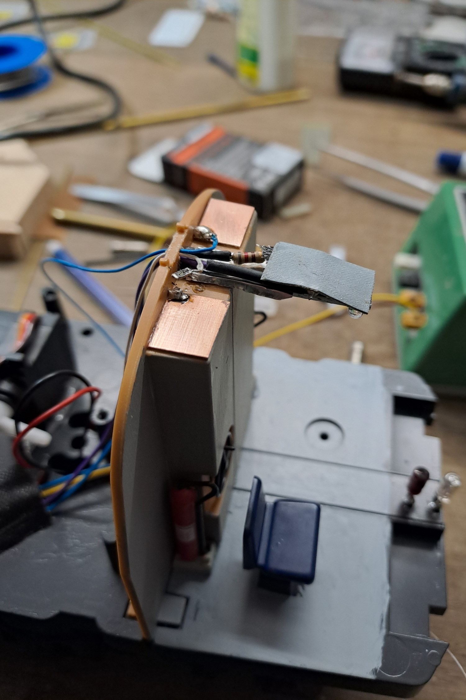 Auf der Unterseite, der Führerstandsinneneinrichtung, befinden sich zwei Platinenstücke, welche den Kontakt zum oberen Spitzenlicht herstellen. Dort sind auch die Widerstände angelötet.