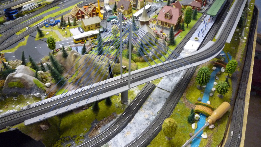 Die Vollmer Vollmetall Bogenbrücke Nr. 2560 ist eingetroffen und überspannt nun die beiden Gleise. Da diese Brücke einen Gitterboden hat, werde ich die C-Gleise in diesem Bereich gegen schotterlose K-Gleise austauschen. Ansonsten fehlen noch die Brückenpfeiler, damit das Provisorium ein Ende hat.