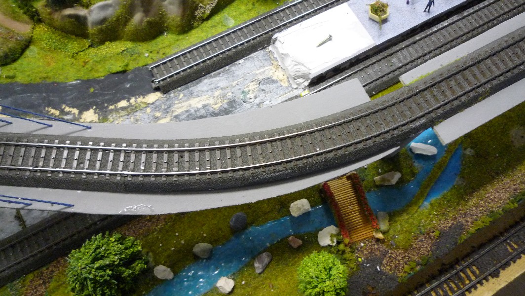 Außerdem verläuft das Gleis zum Schattenbahnhof 2 nun spiegelverkehrt herunter, daher befindet sich die Weiche nun direkt vor der Bahnhofseinfahrt Mittelstadt. Wie man links im Bild sieht ist der Brückenpfeiler im Weg. Wahrscheinlich wird die Brücke leicht versetzt werden.
