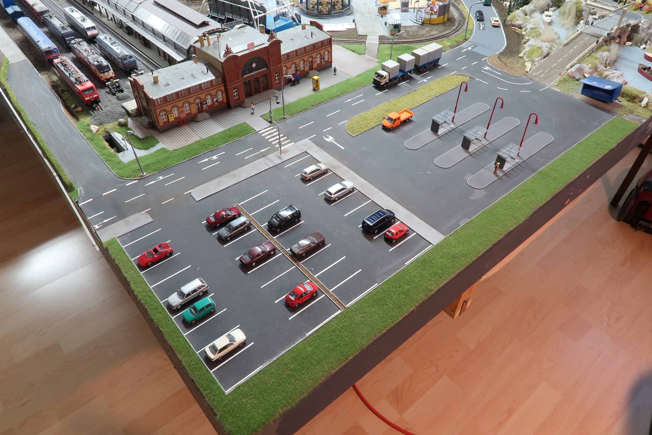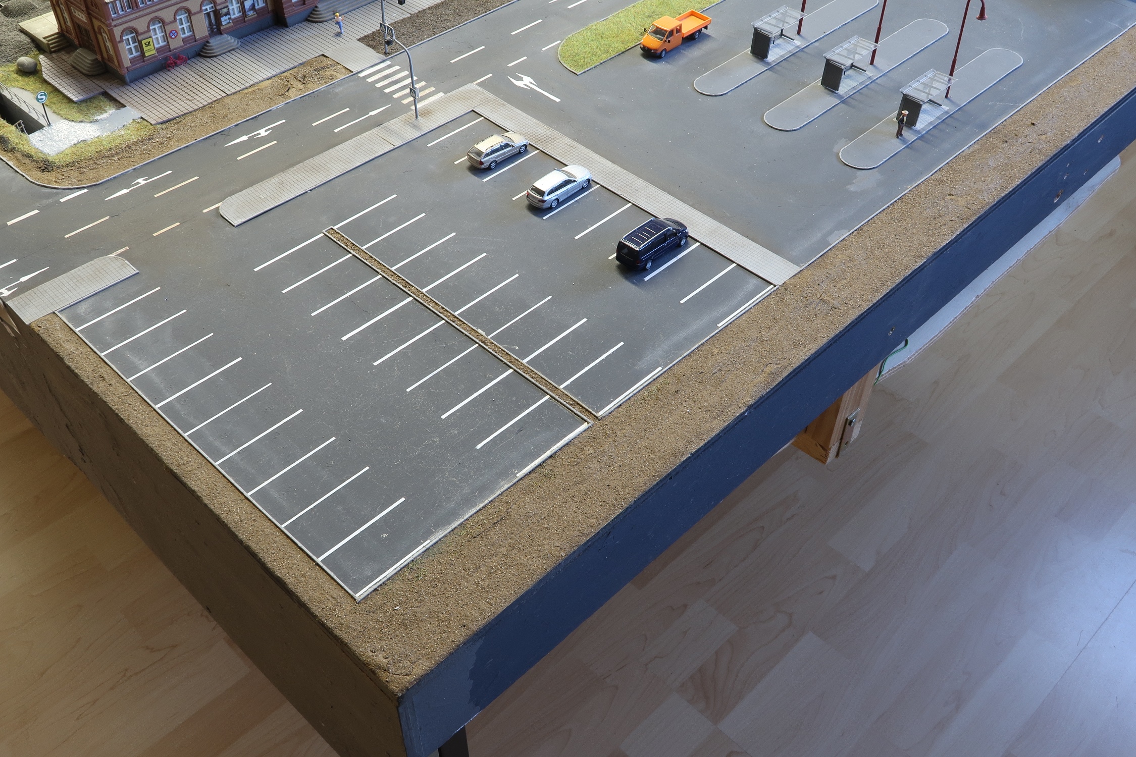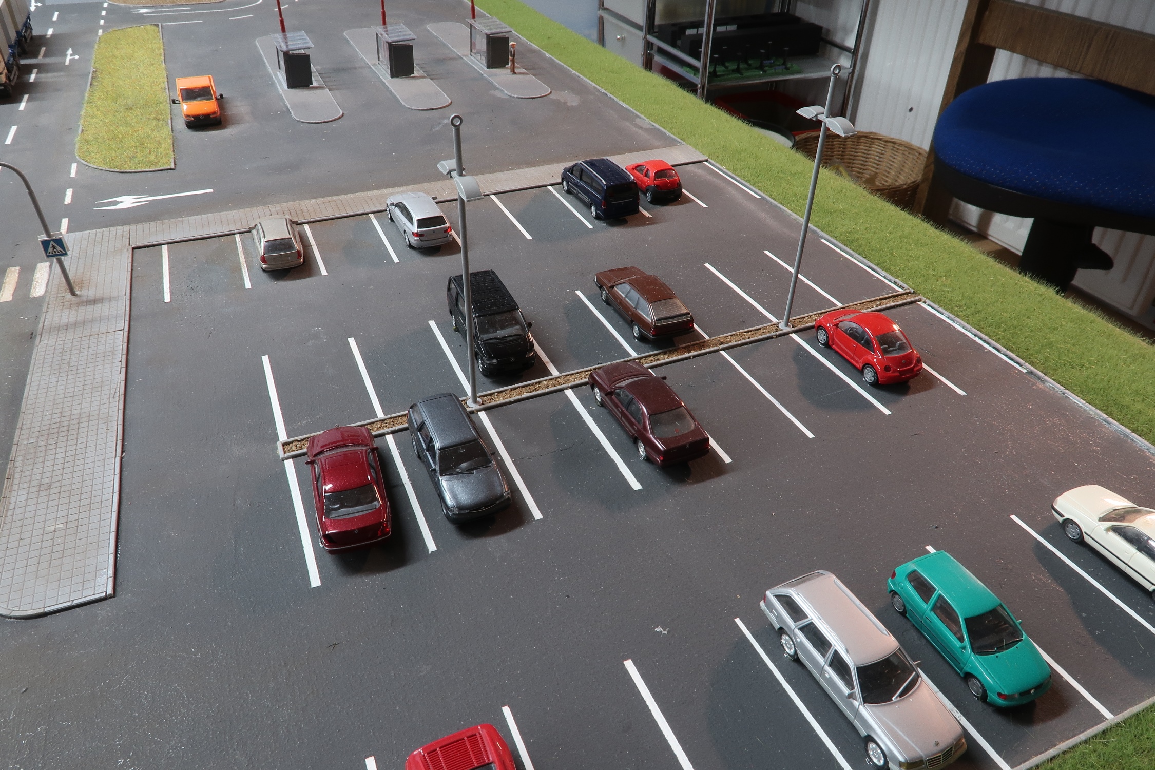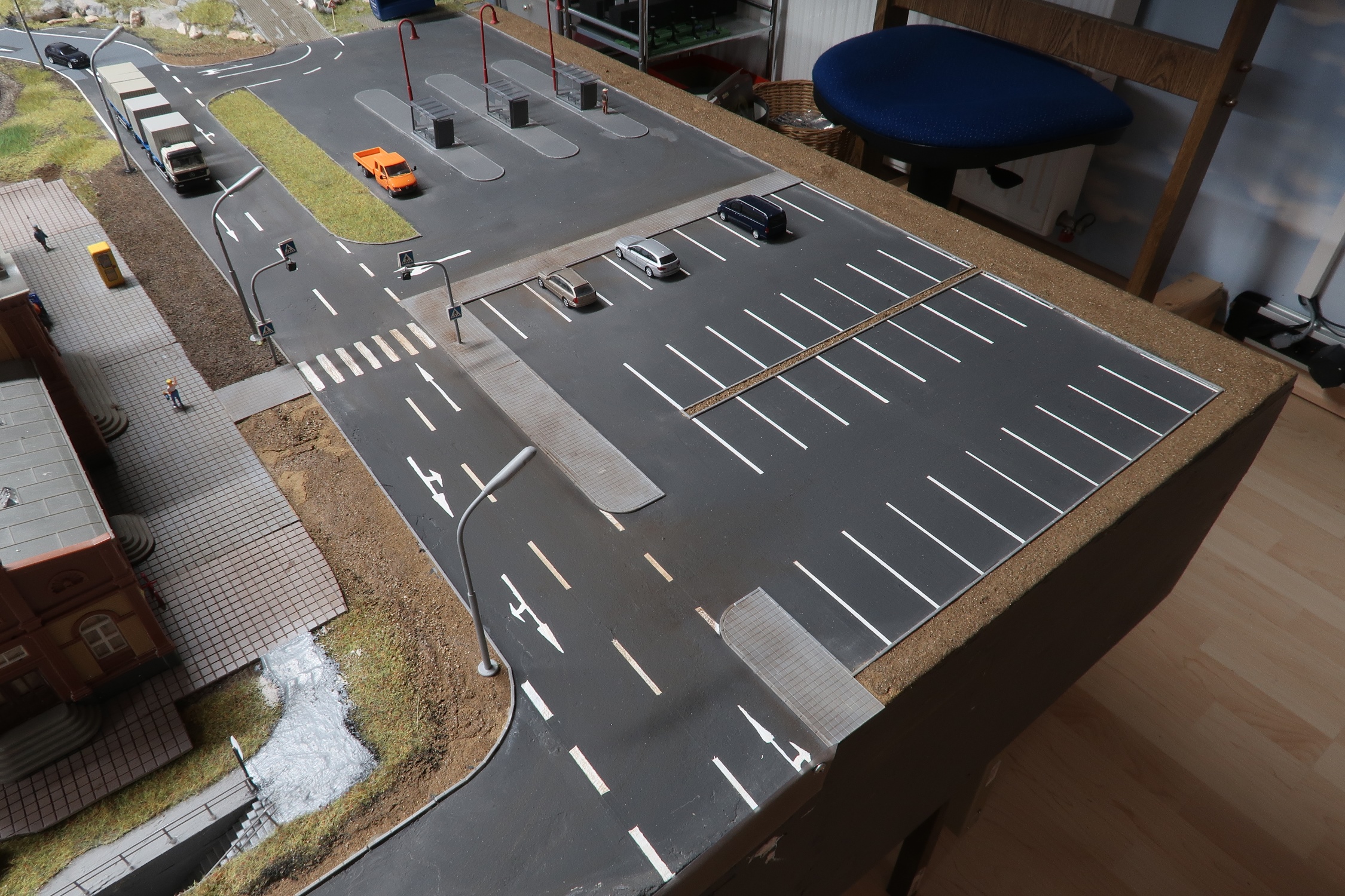 nicht mehr zugesagt. Die Parkplätze sind jetzt aus Kibri Kopfsteinpflaster-Platten hergestellt und auf selber Ebene wie