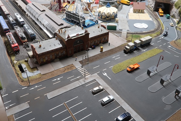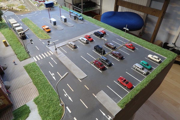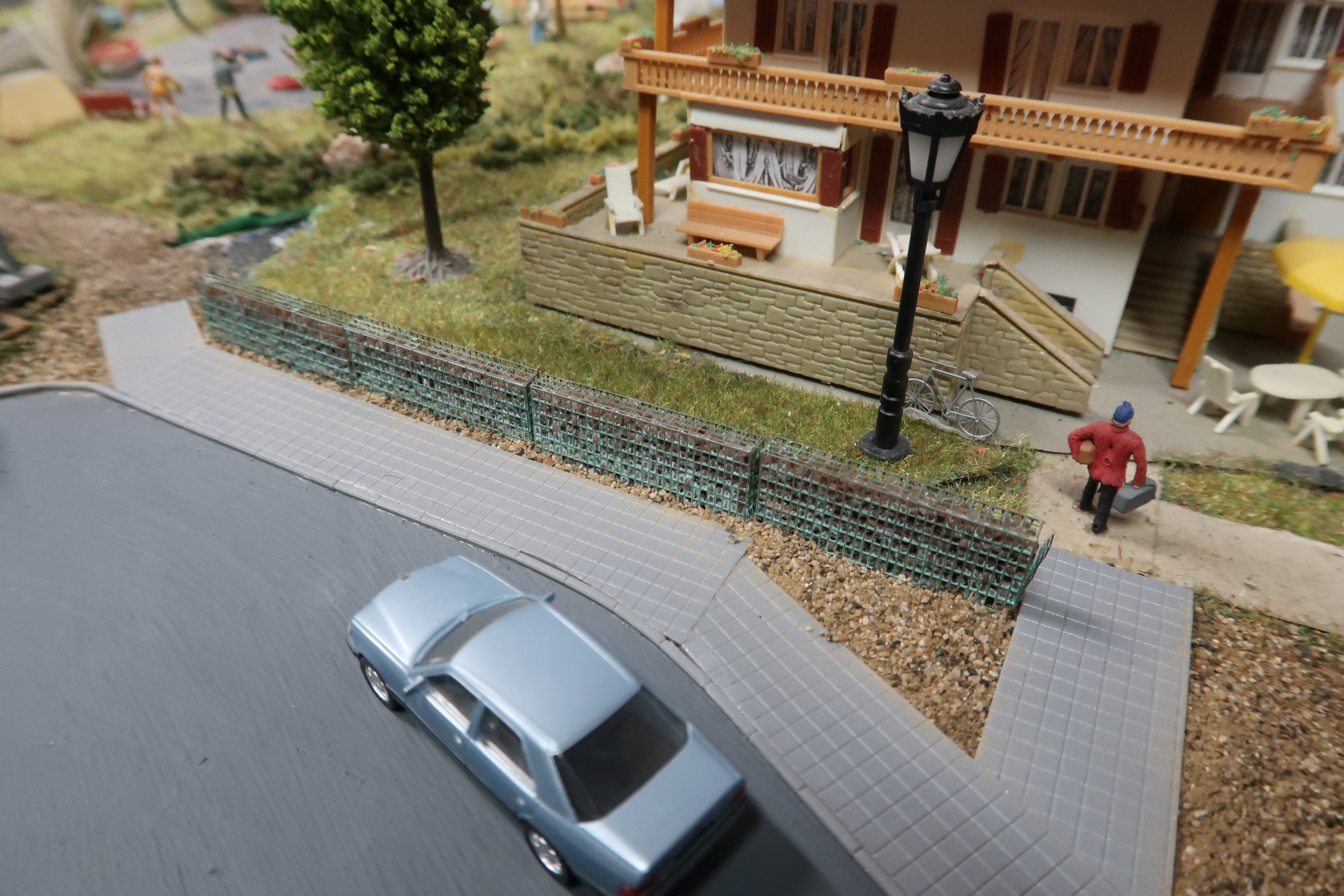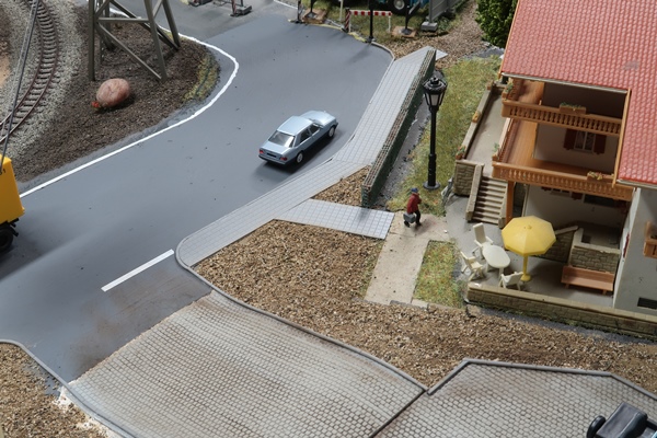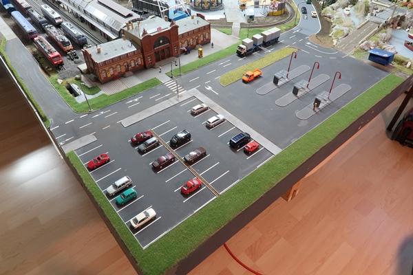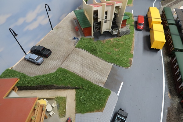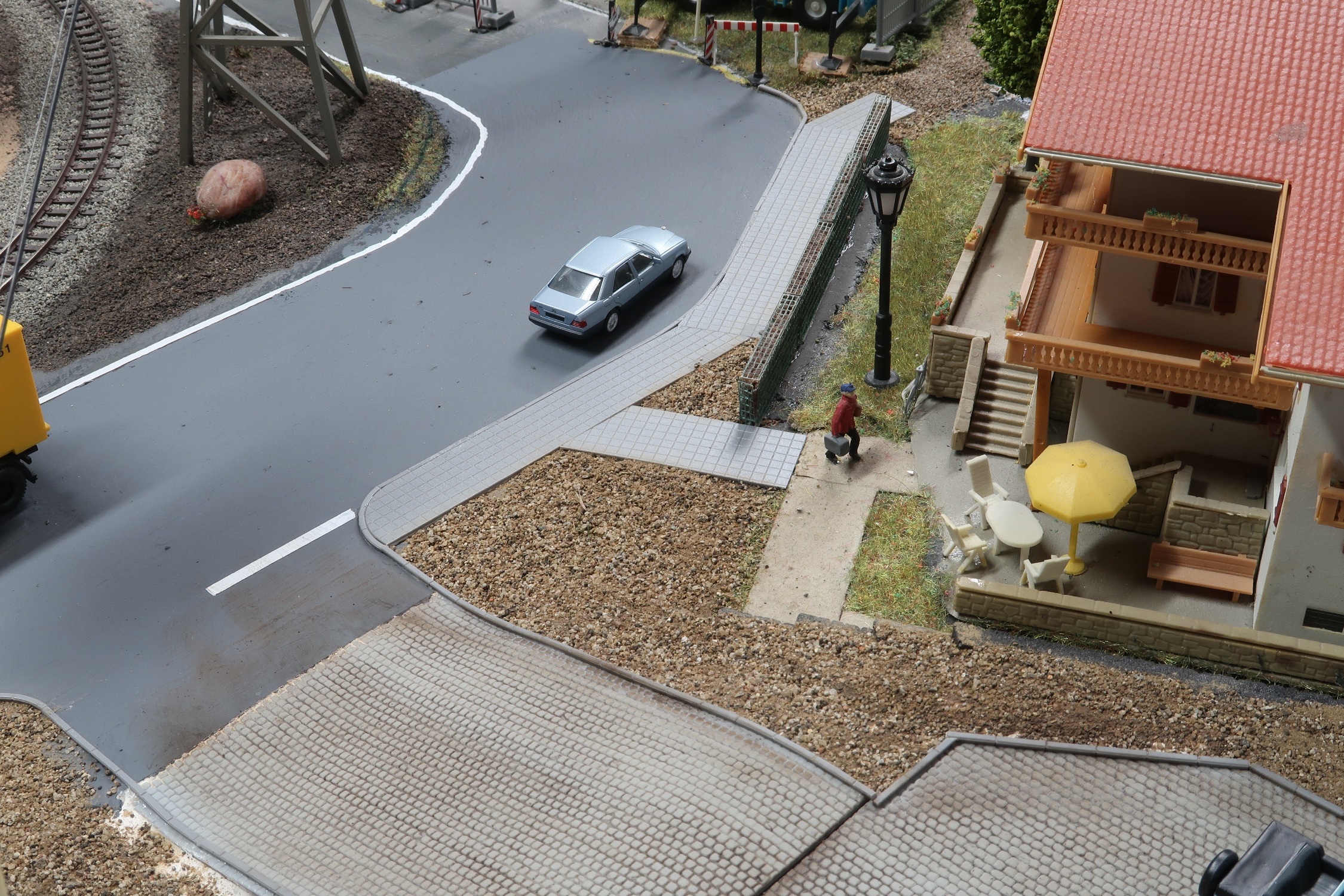 nicht mehr zugesagt. Die Parkplätze sind jetzt aus Kibri Kopfsteinpflaster-Platten hergestellt und auf selber Ebene wie