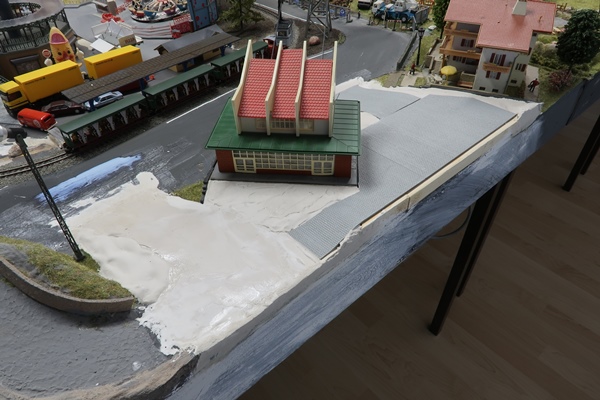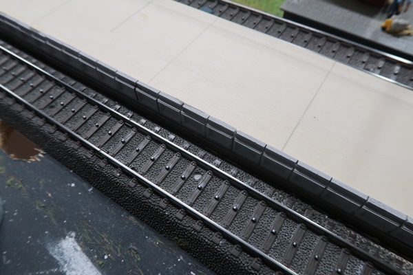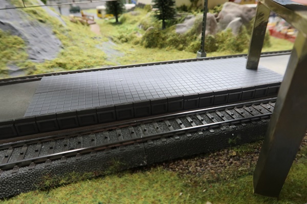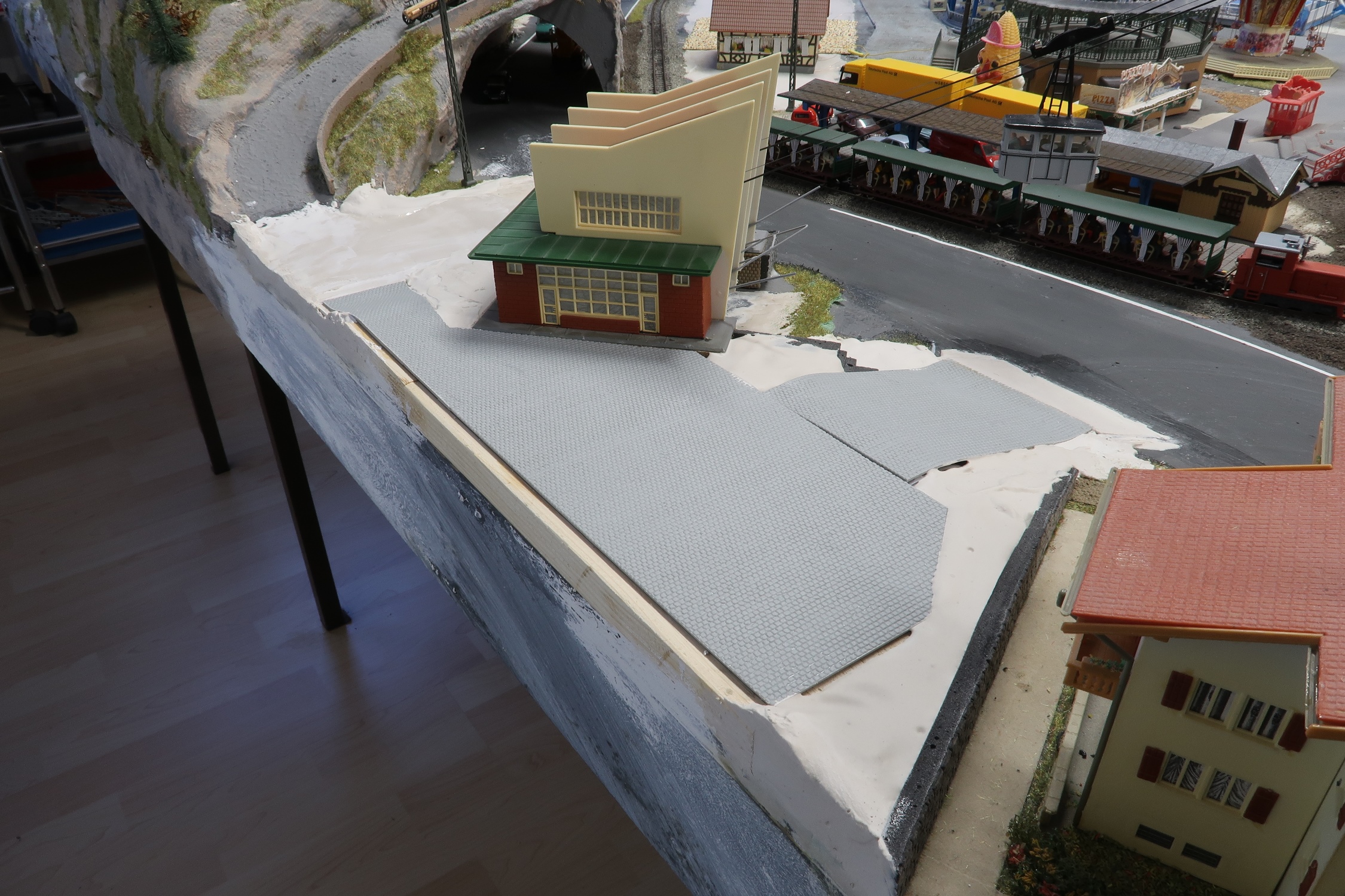 Darauf folgt eine Platte, an welche die Bahnsteigkanten von Vampisol geklebt werden. Diese Platte muss exakt eingepasst werden,