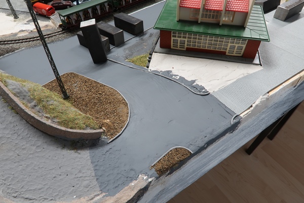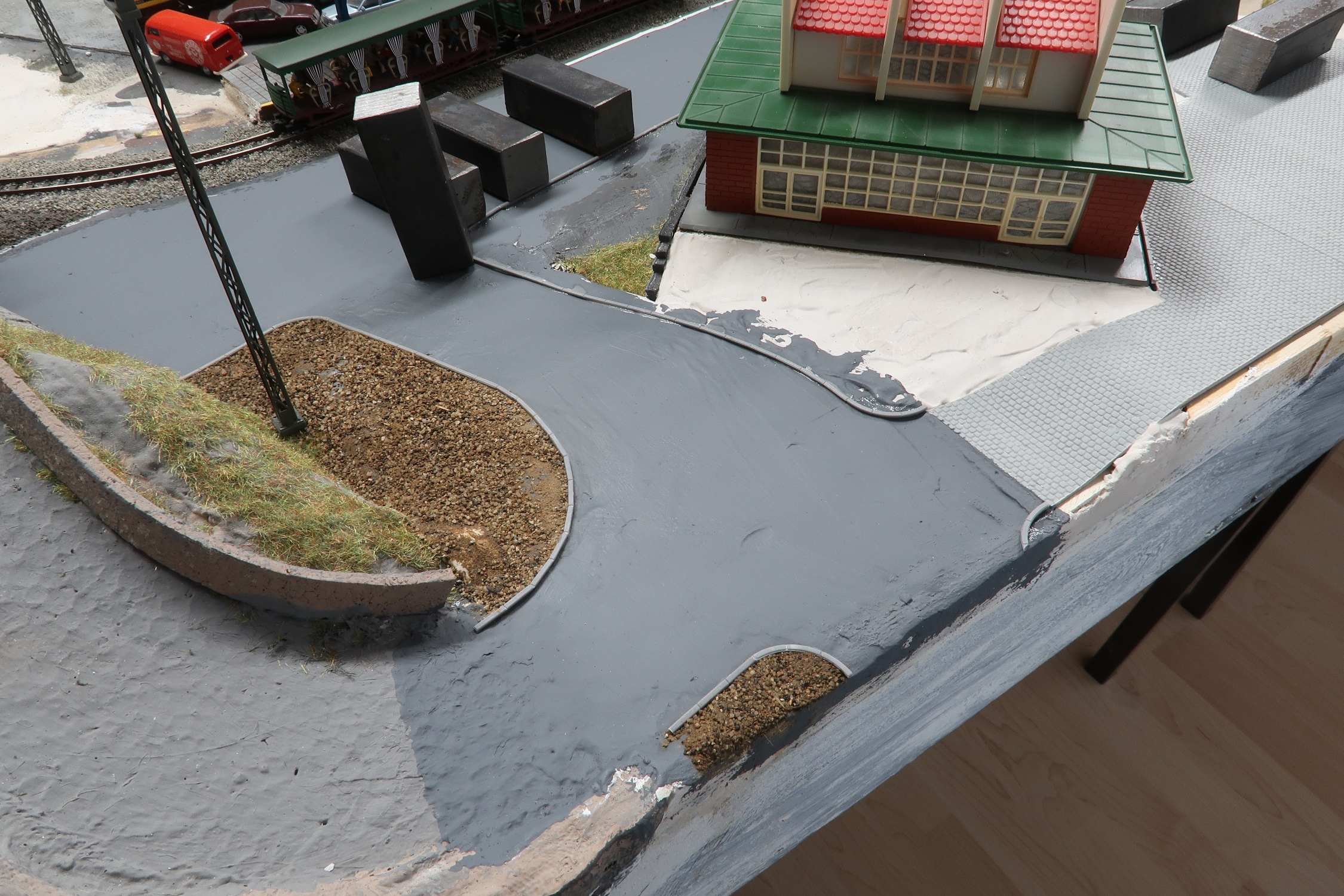 Die Bahnsteigkanten werden mit grauer Farbe lackiert, anschließend gealtert und mit mattem Klarlack versiegelt.