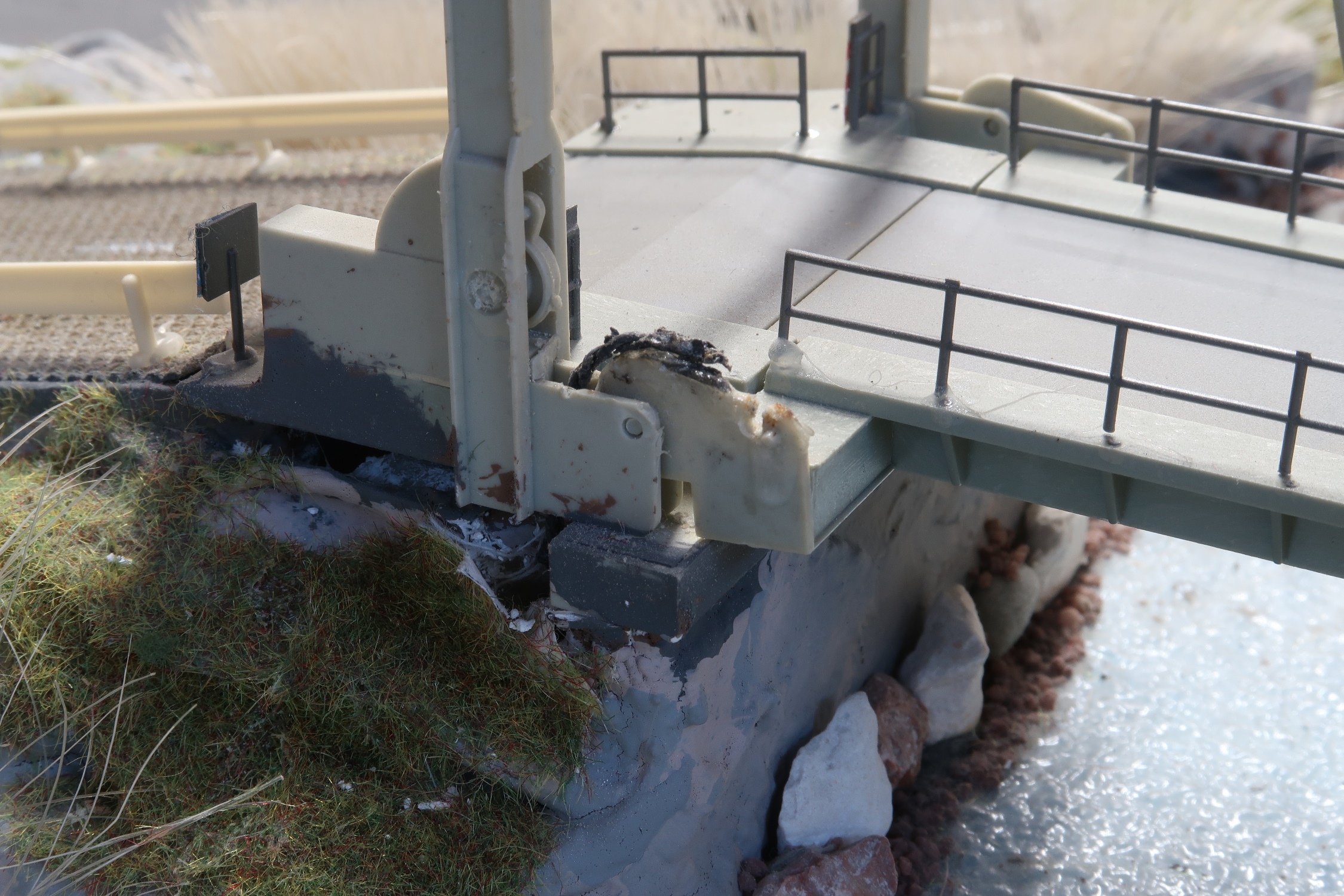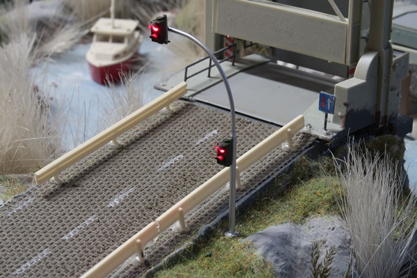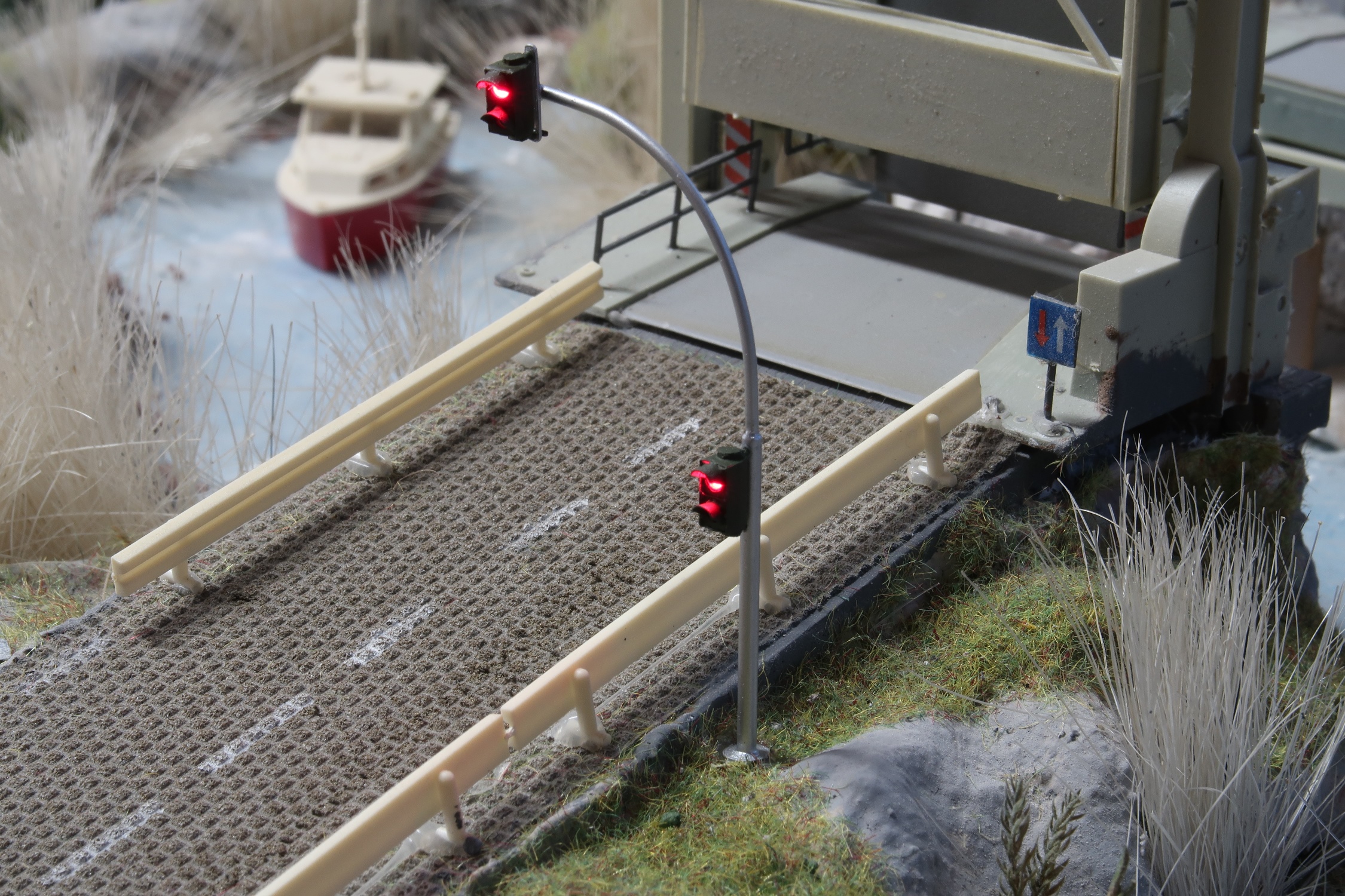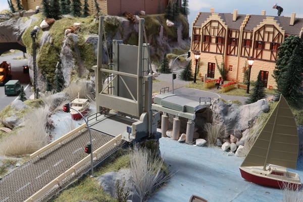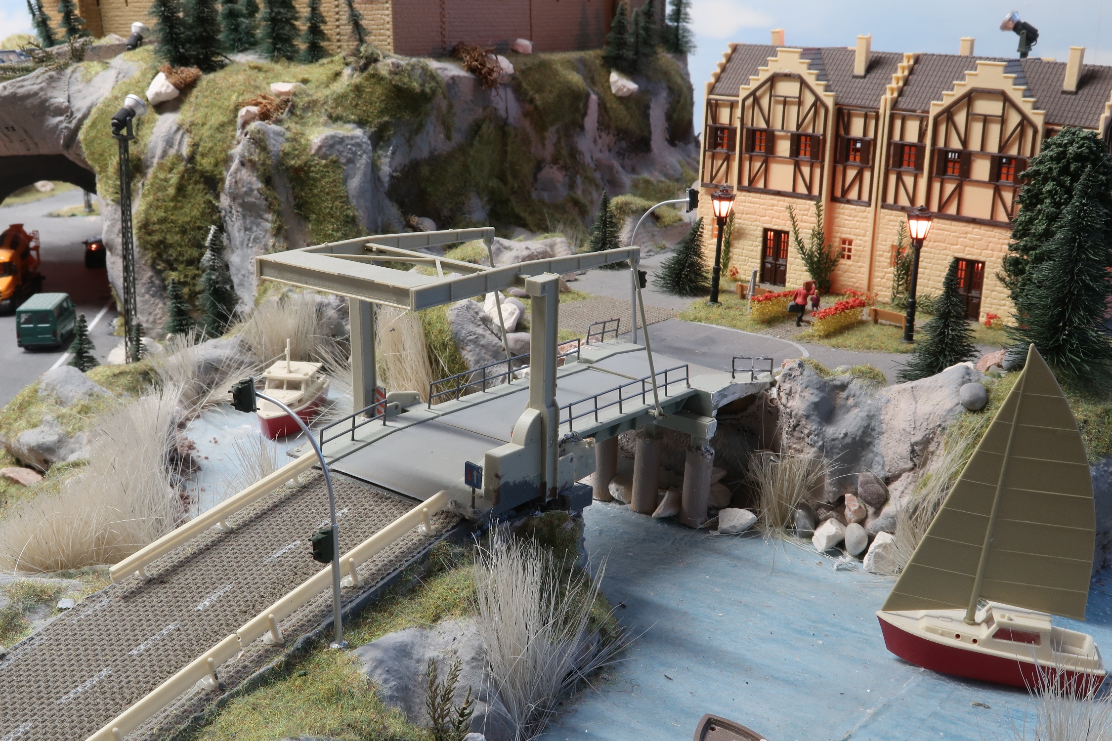 Auf die kleine Insel neben der Burg führt eine Straße. Damit Boote unter der Straße durchfahren können wurde eine Klappbrücke von Kibri installiert. Richtig