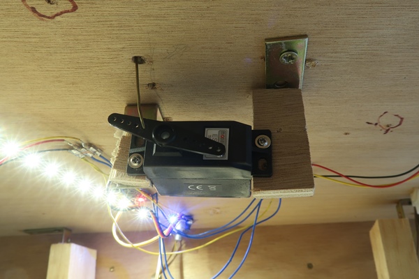 Am Hebelarm der Klappbrücke habe ich einen Draht angeklebt. Dieser wird unterirdisch mit einem Messingdraht verlötet welcher wiederum mit dem Ruderhorn vom Servo verbunden wird.