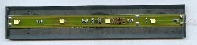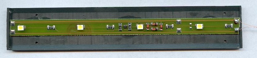 Nun kann man die Innenbeleuchtung einbauen. Fertige Innenbeleuchtungen gibt es von Tams bzw. zum selber bauen. Fertige Beleuchtungen muss man kürzen, so dass diese in den Bus hineinpasst. An eine Seite der Platine lötet man zwei Anschlusskabel an. Am besten ist hierfür Kupferlackdraht. Jetzt kann man die Innenbeleuchtung am Dach des Busses ankleben. Die Anschlusskabel sollten am Heck des Busses sein.