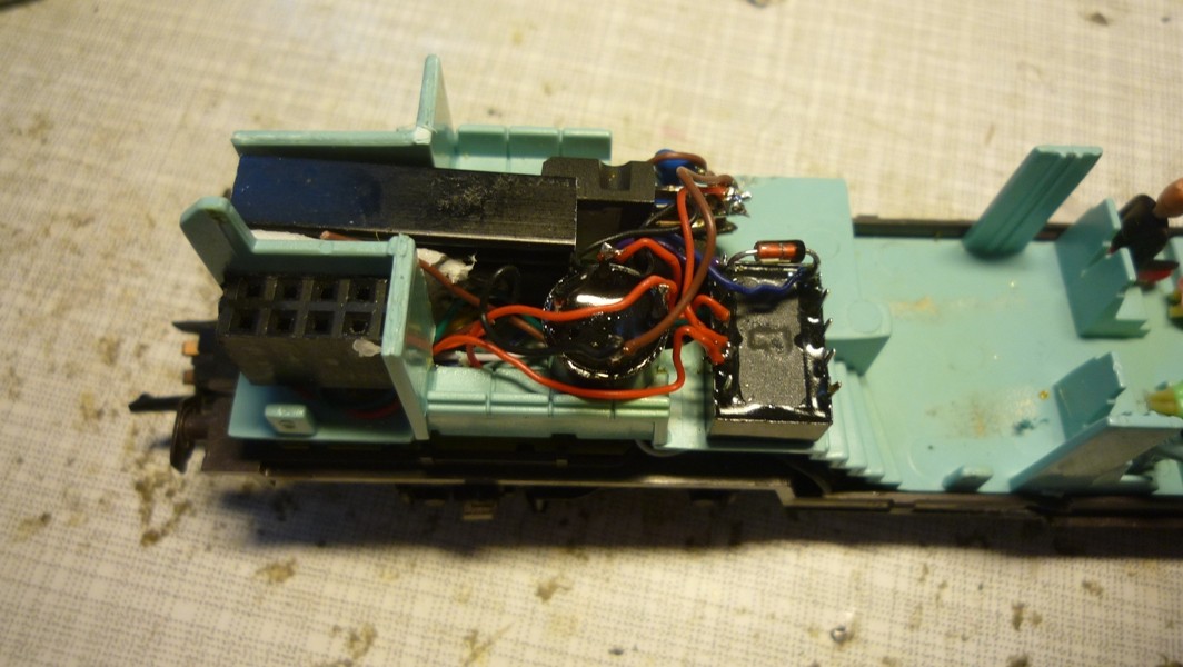 (+ Kondensator, - Kondensator, Decoderplus, Licht weiß, Licht rot, Innenbeleuchtung) werden an eine