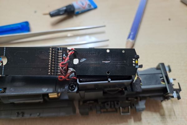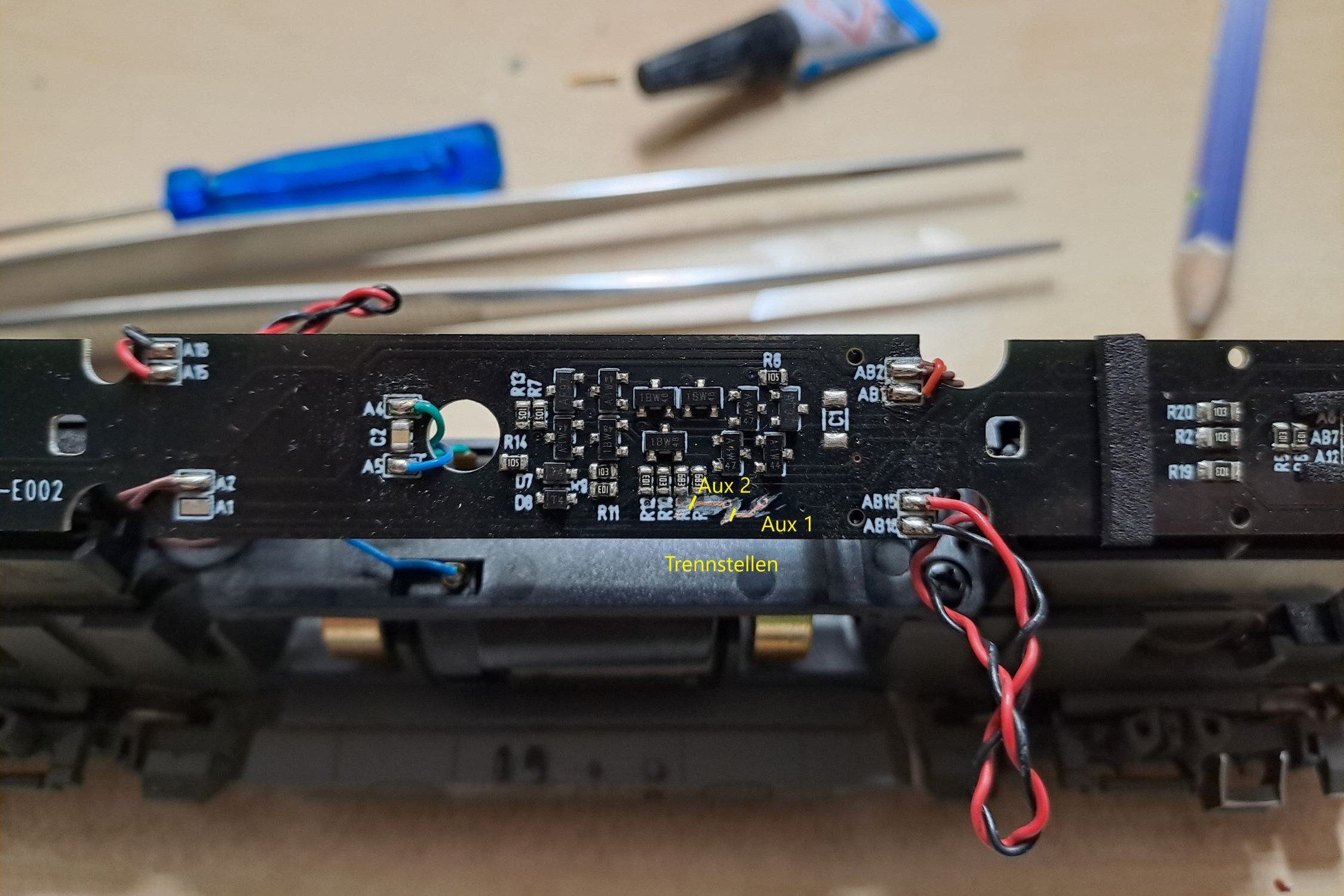 Vom Decoder ausgehend müssen die Ausgänge Aux 1 und Aux 2 ebenfalls von der Fahrzeugelektronik abgetrennt und die Leiterbahn angeschliffen werden.
