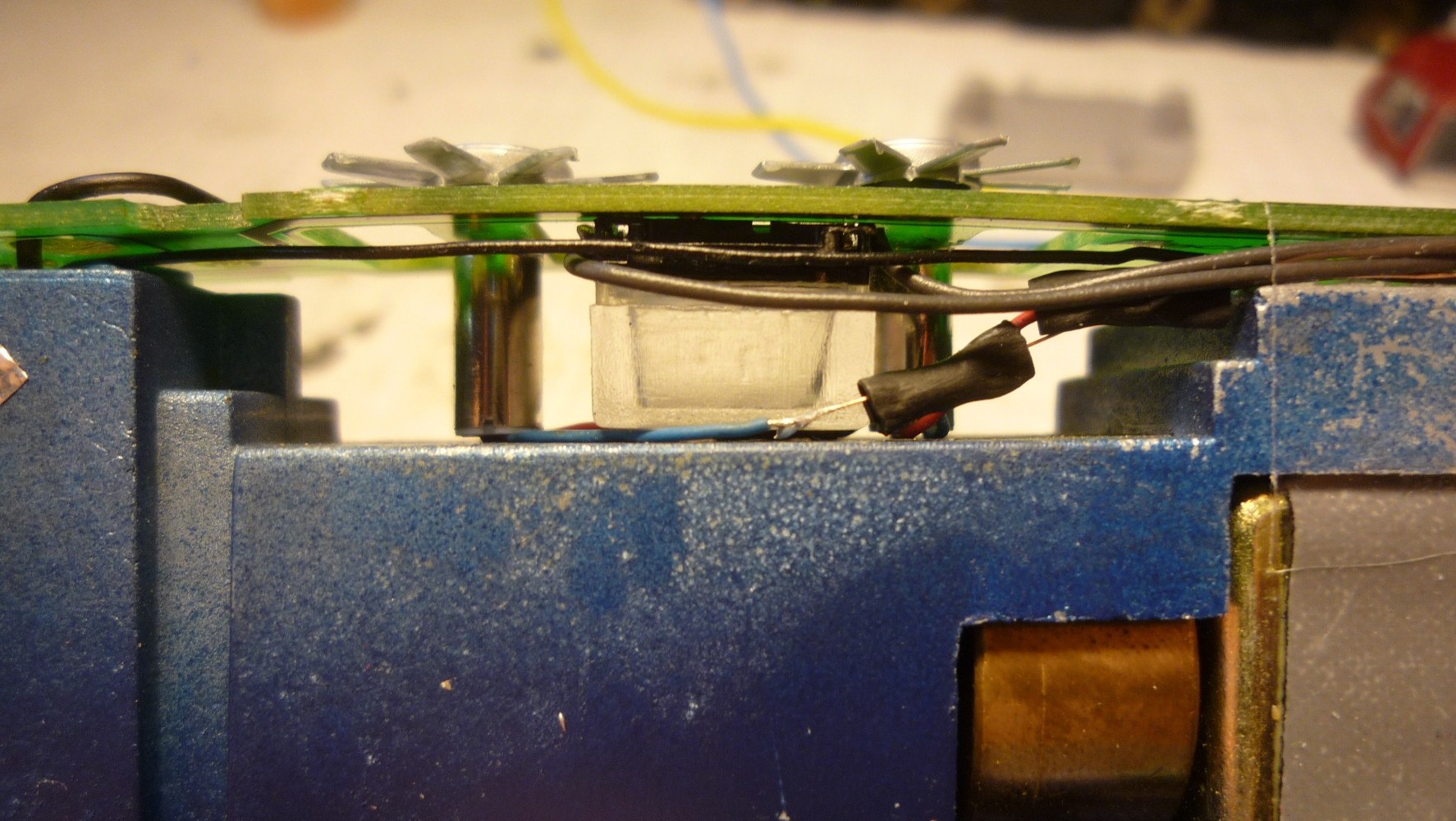 des Motors dort reinpasst. Die Leiterplatte wird abgeschraubt, die Welle wird durch das Loch gesteckt und