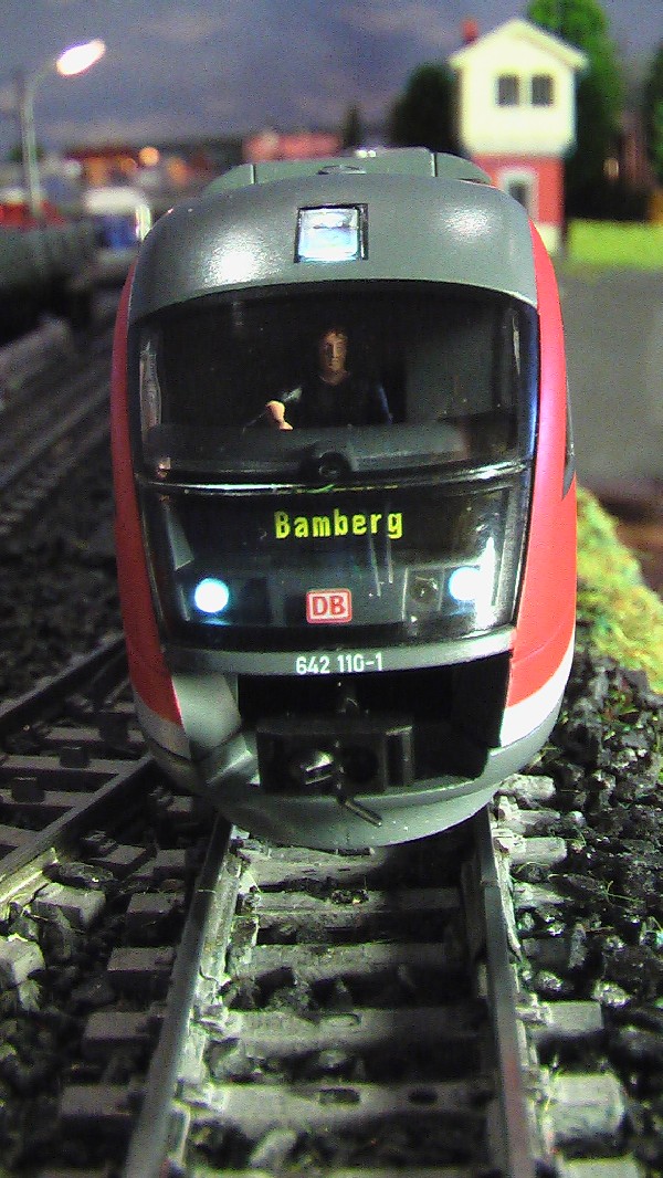 Im Blick nun die Zugzielanzeige mit Aufschrift "Bamberg" und die Scharfenbergkupplung.