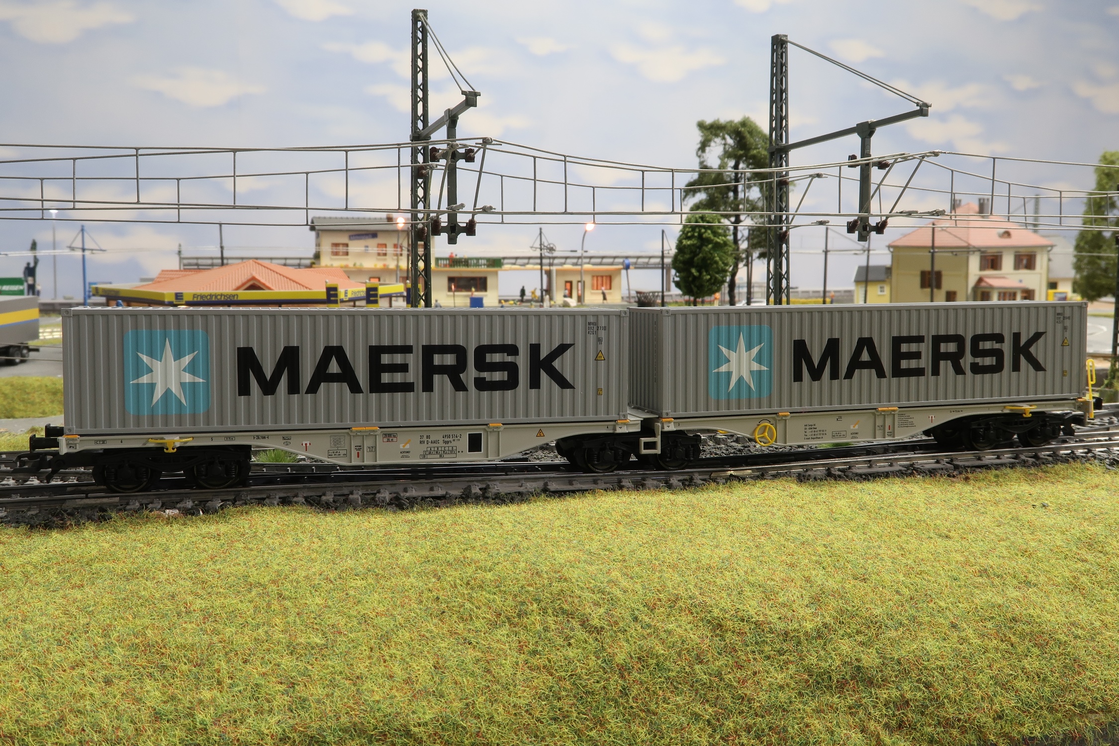 1 sechsachsiges Container-Tragwagen-Paar Typ Sggrss 80 mit zwei "Maersk" Containern von Märklin Nr. 47803.