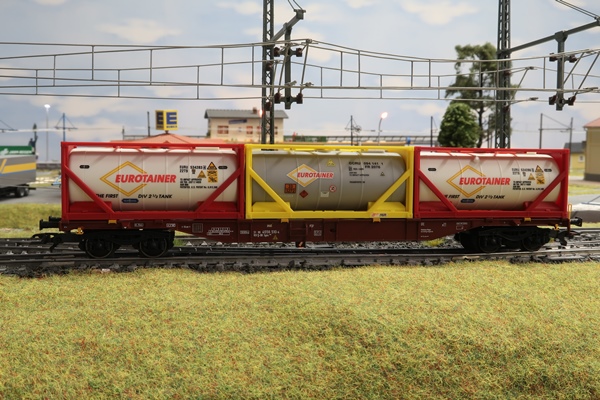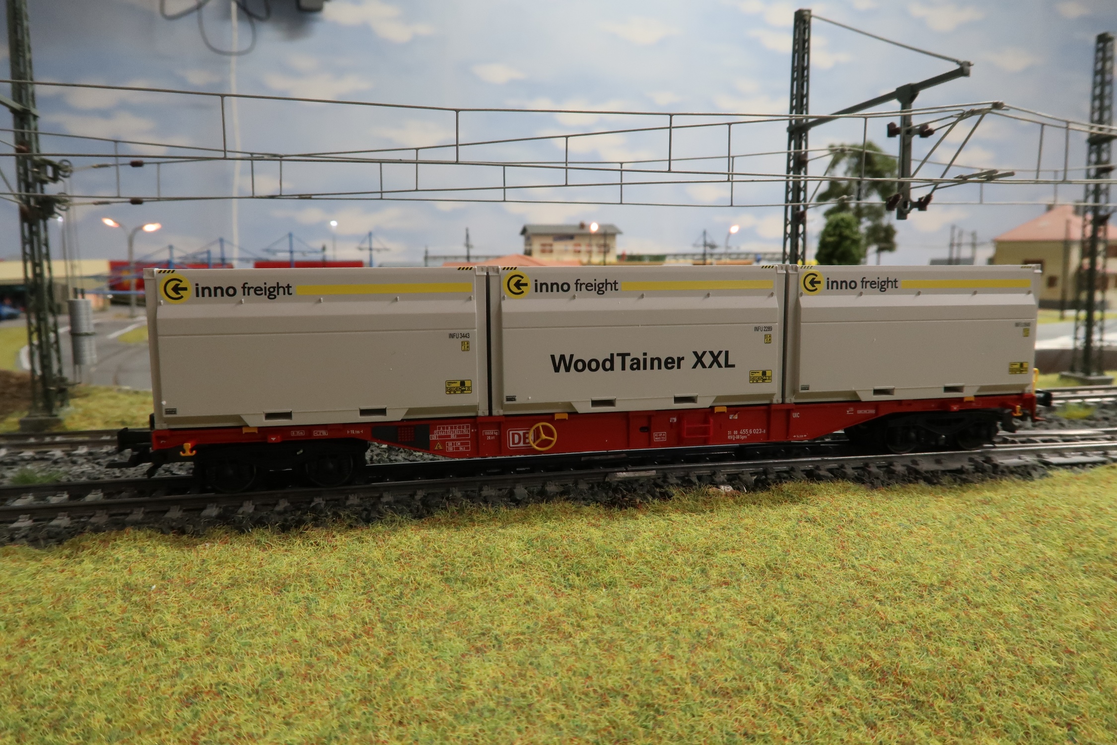 1 achtachsiges Container-Tragwagen-Paar mit sechs "Innofreight-Containern" von B-models Nr. 90111.