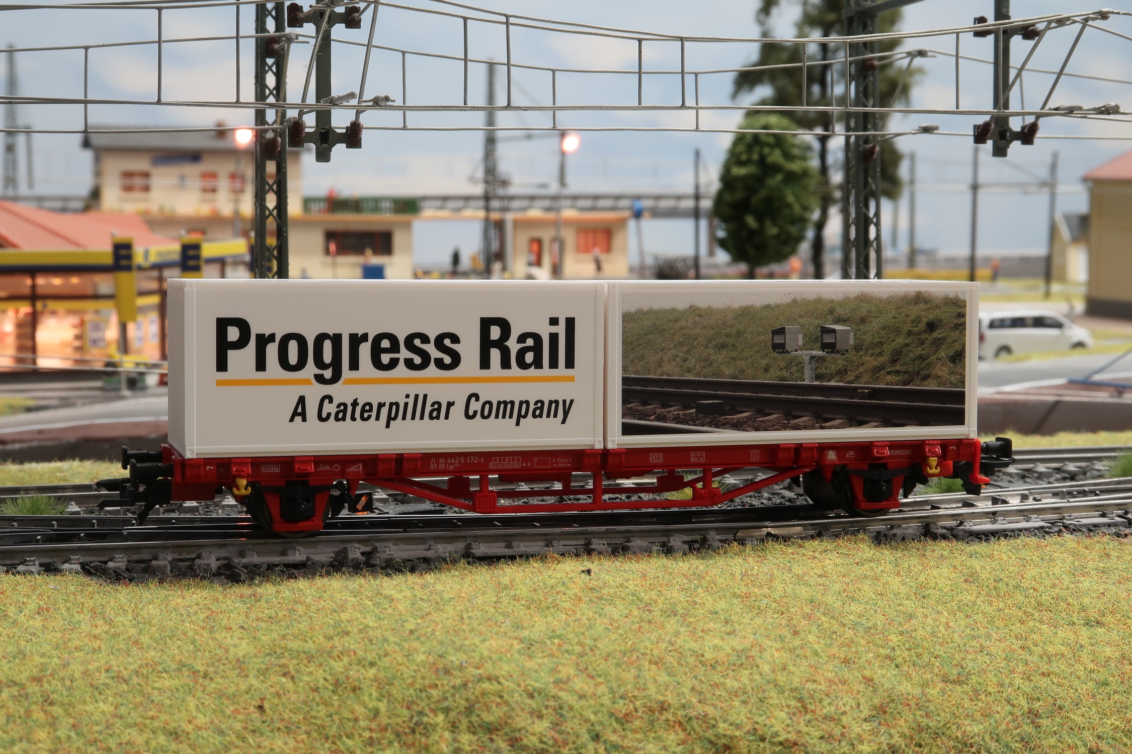 1 zweiachsiger Container-Tagwagen mit zwei "Progress Rail" Containern von Piko Nr. 95876/137 (Werbemodell).