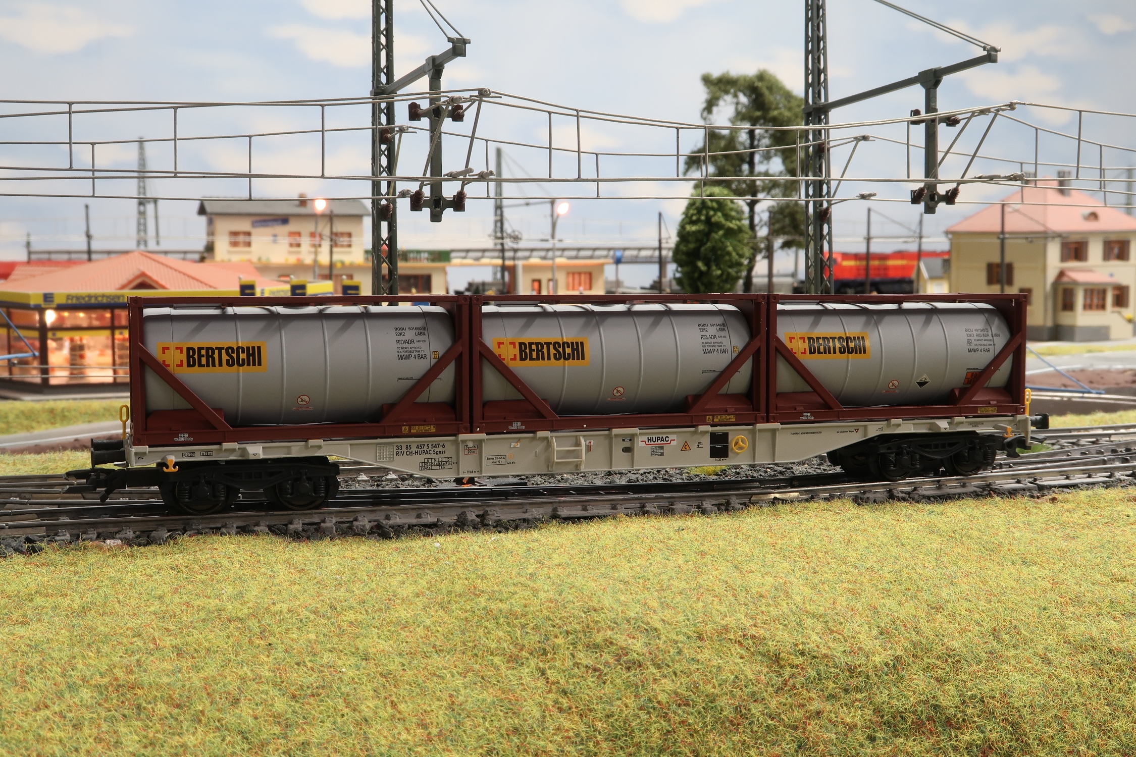 1 vierachsiger Container-Tragwagen mit drei Containern "Bertschi" von Märklin Nr. 47097.