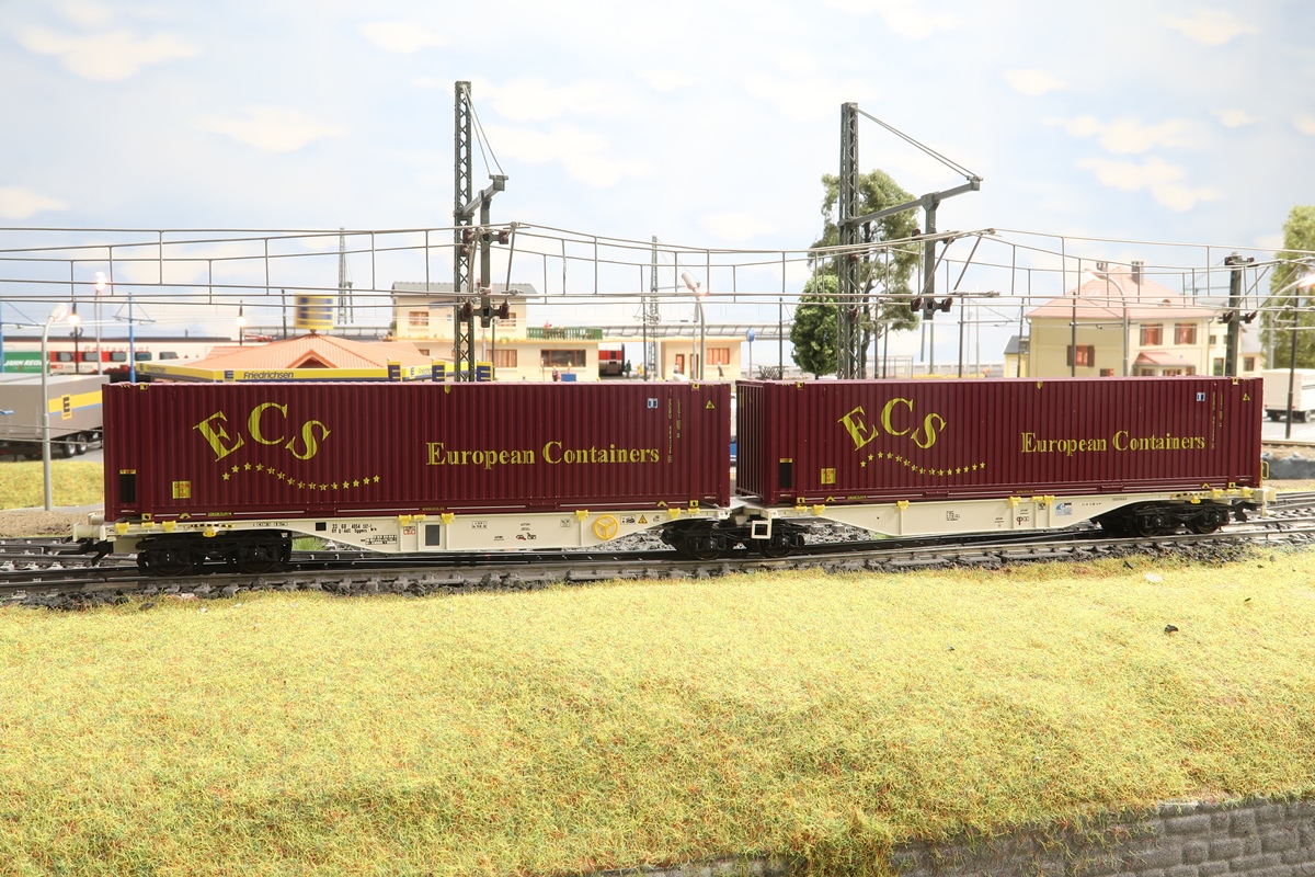 1 sechsachsiges Container-Tragwagen-Paar Typ Sggmrss 90 mit zwei "ECS" Containern von B-models Nr. 59100.