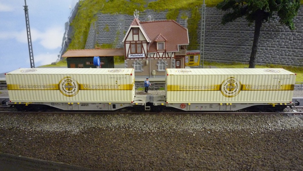 1 sechsachsiges Container-Tragwagen-Paar Typ Sggmrss 90' mit zwei "Warsteiner" Containern von Mehano Nr. 58787.