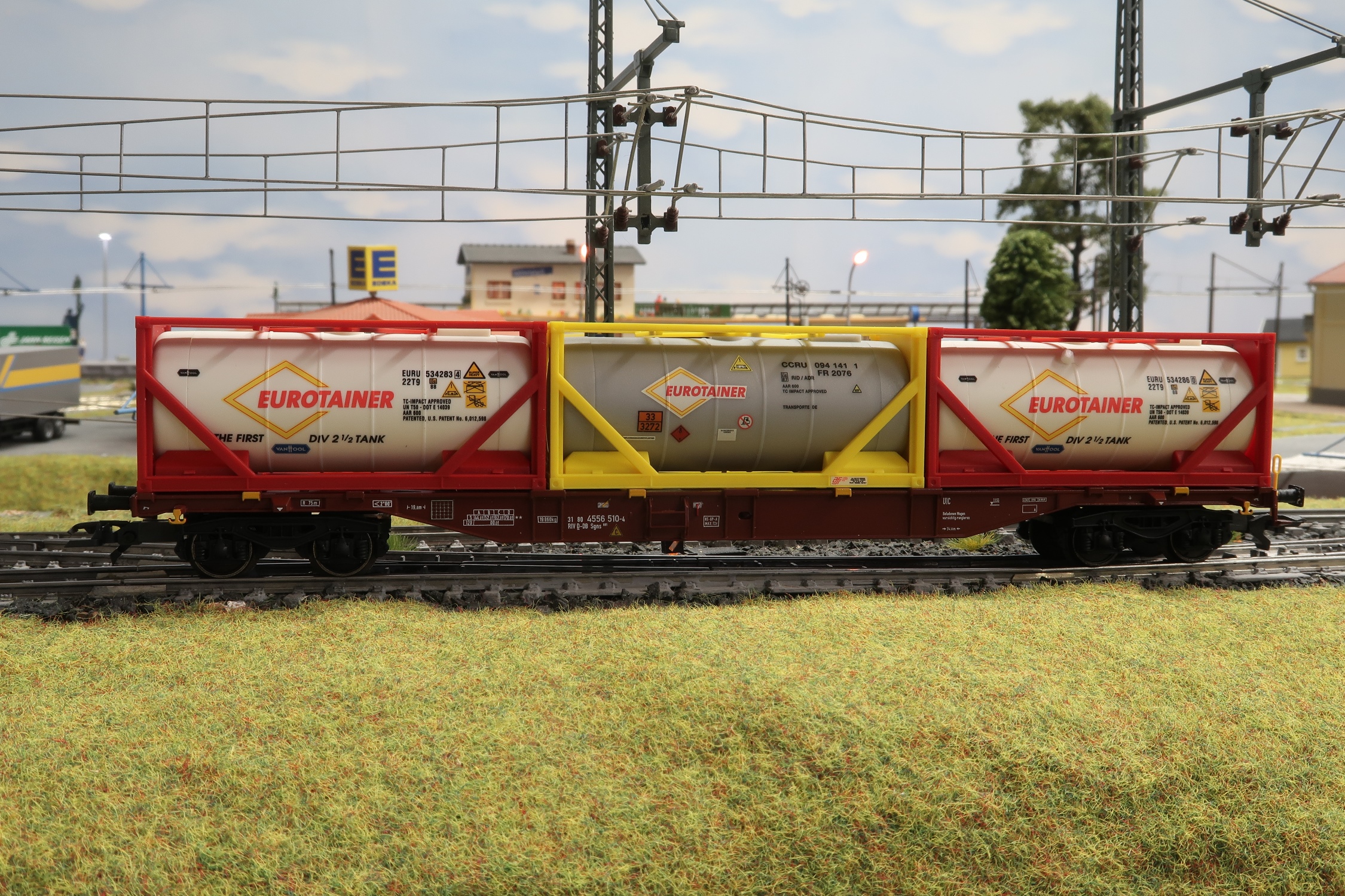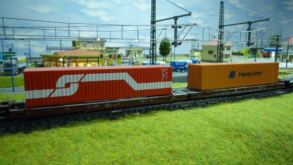 1 vierachsiger Container-Tragwagen mit drei Containern von Märklin Nr. 47072.