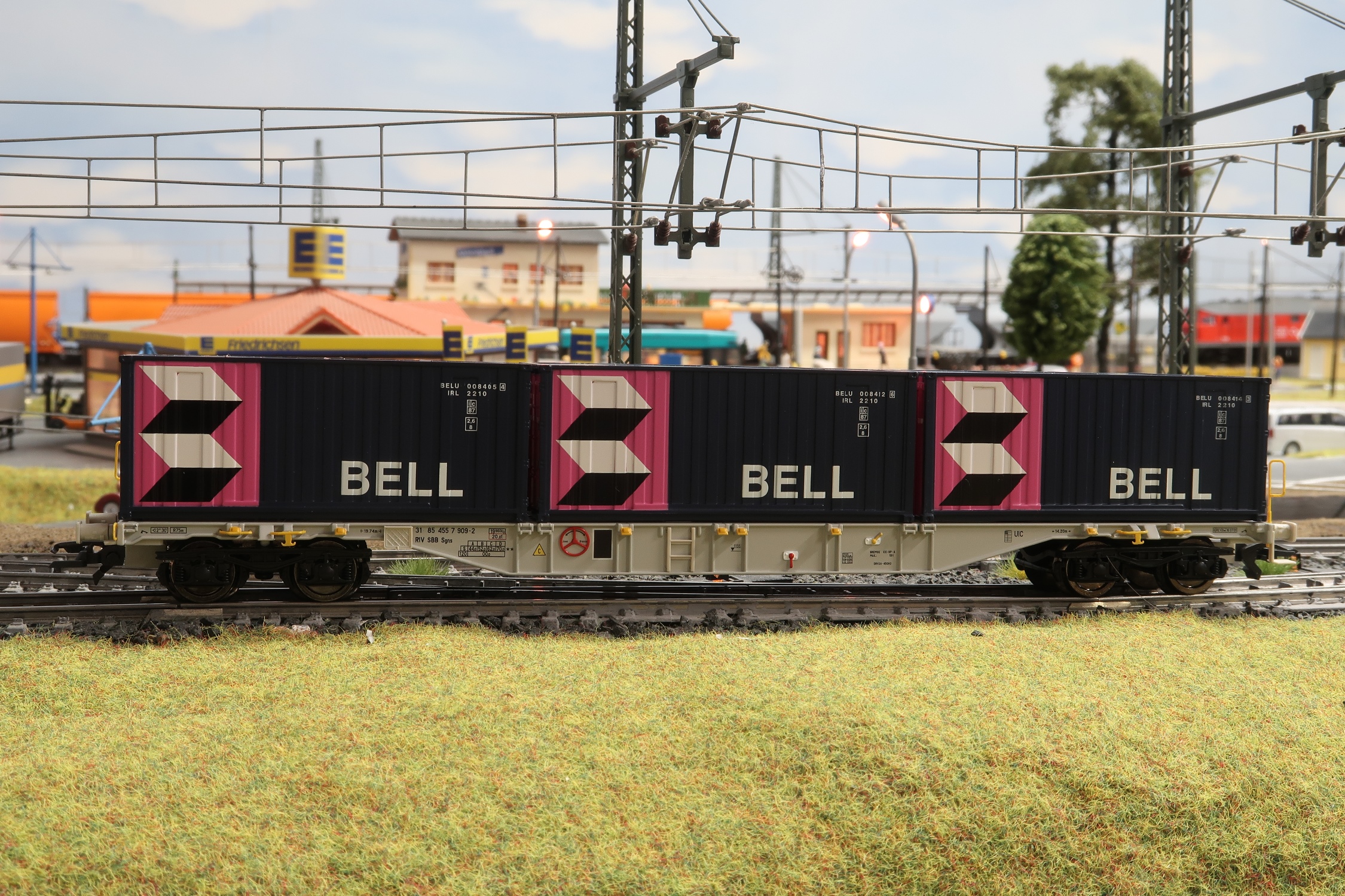 1 vierachsiger Container-Tragwagen mit drei Containern "BELL" von Roco Nr. 66656.