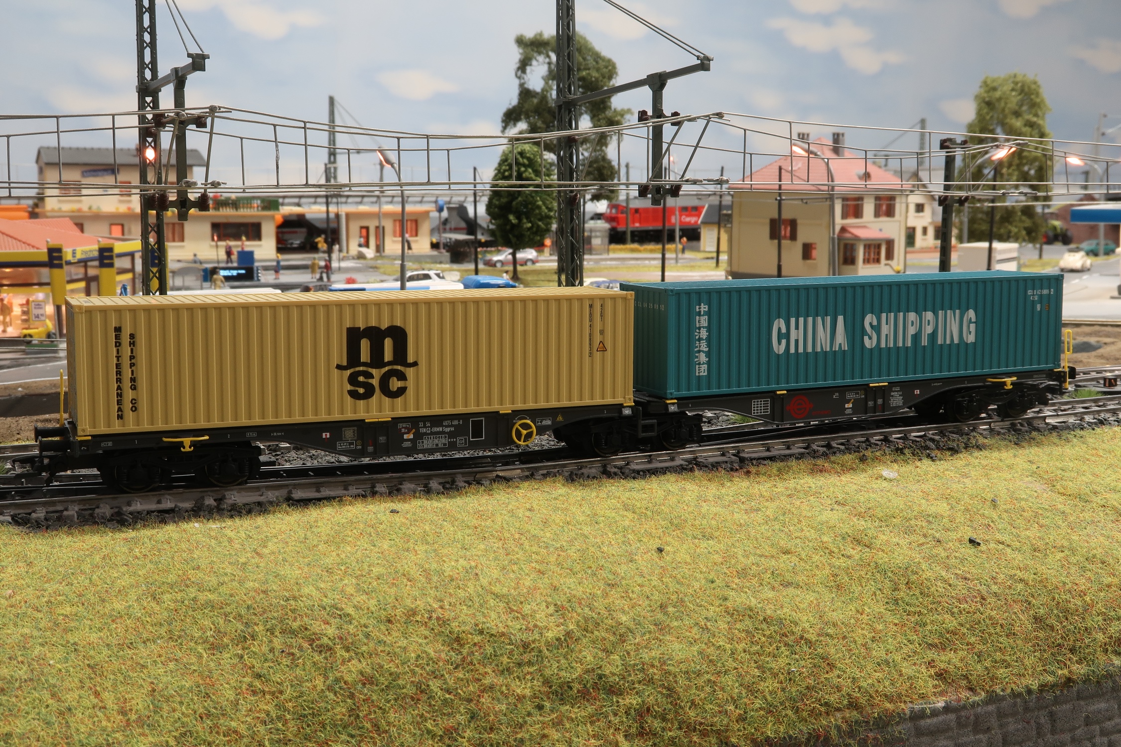 1 sechsachsiges Container-Tragwagen-Paar Typ Sggrss 80 mit zwei Containern "MSC" sowie "China Shipping" von Trix Nr. 24803.