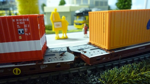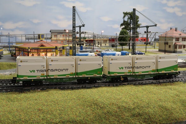 2 vierachsige Container-Tragwagen mit je drei "Innofreight-Containern" von Märklin Nr. 47074.