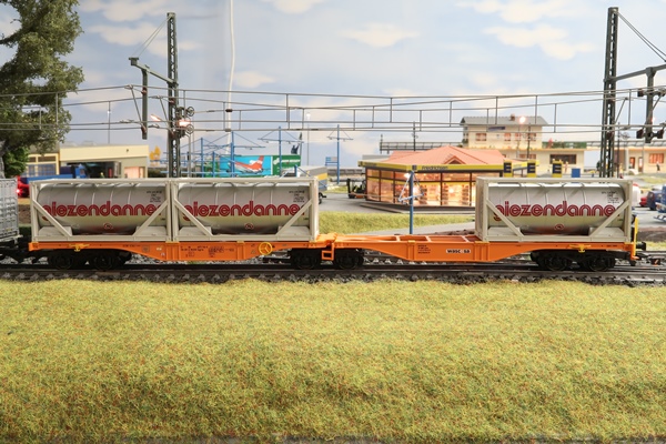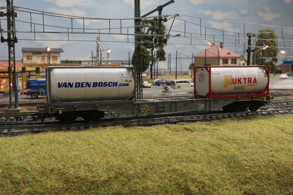 1 vierachsiger Container-Tragwagen mit zwei Containern "Huktra" und "Van Den Bosch" von B-models Nr. 54138.